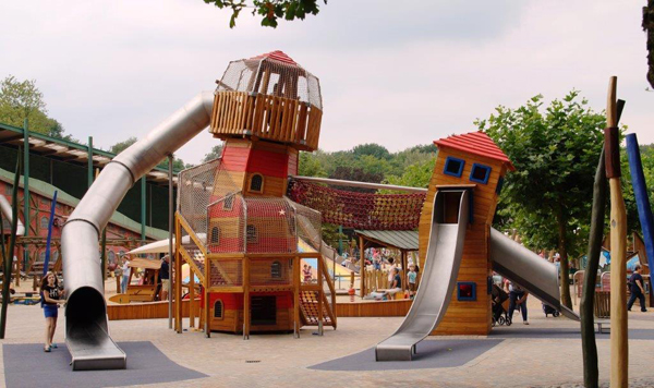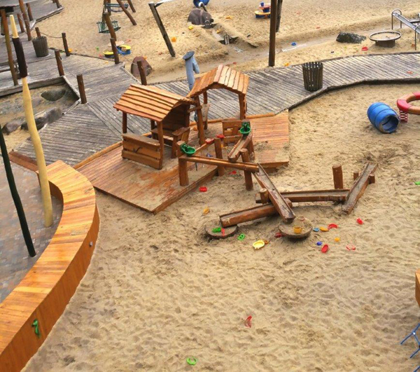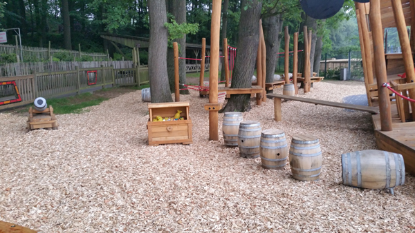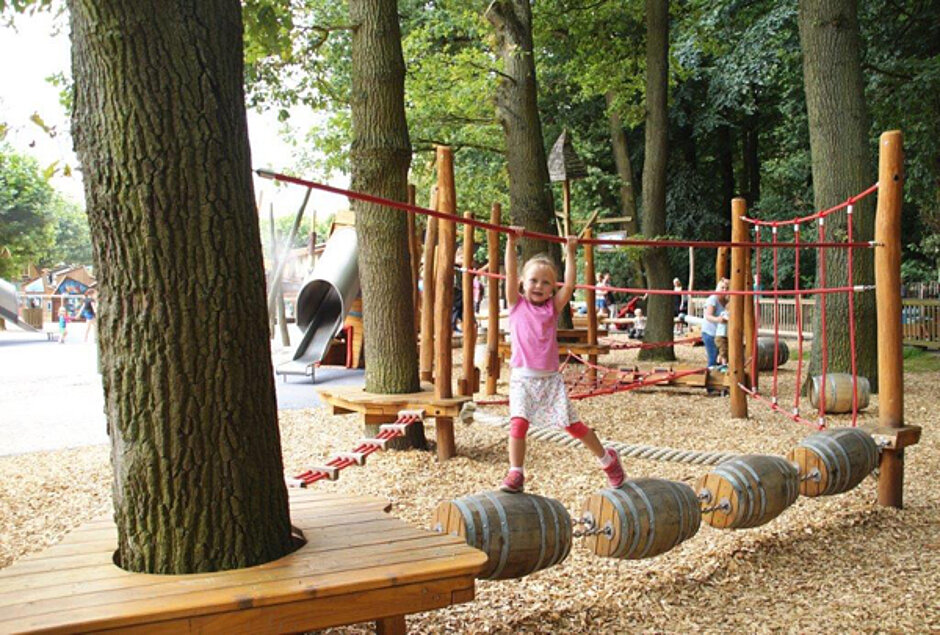 Außerdem hat ein gestrandetes Schiff seine komplette Ladung verloren, die zum Teil in den Baumbestand gespült wurde und dort nun zum klettern und balancieren einlädt. Das eingelaufene Wasser des Segelschiffes kann über die Wasserkanonen herausgespritzt werden und sorgt für jede Menge Spielspaß bei den Kindern.