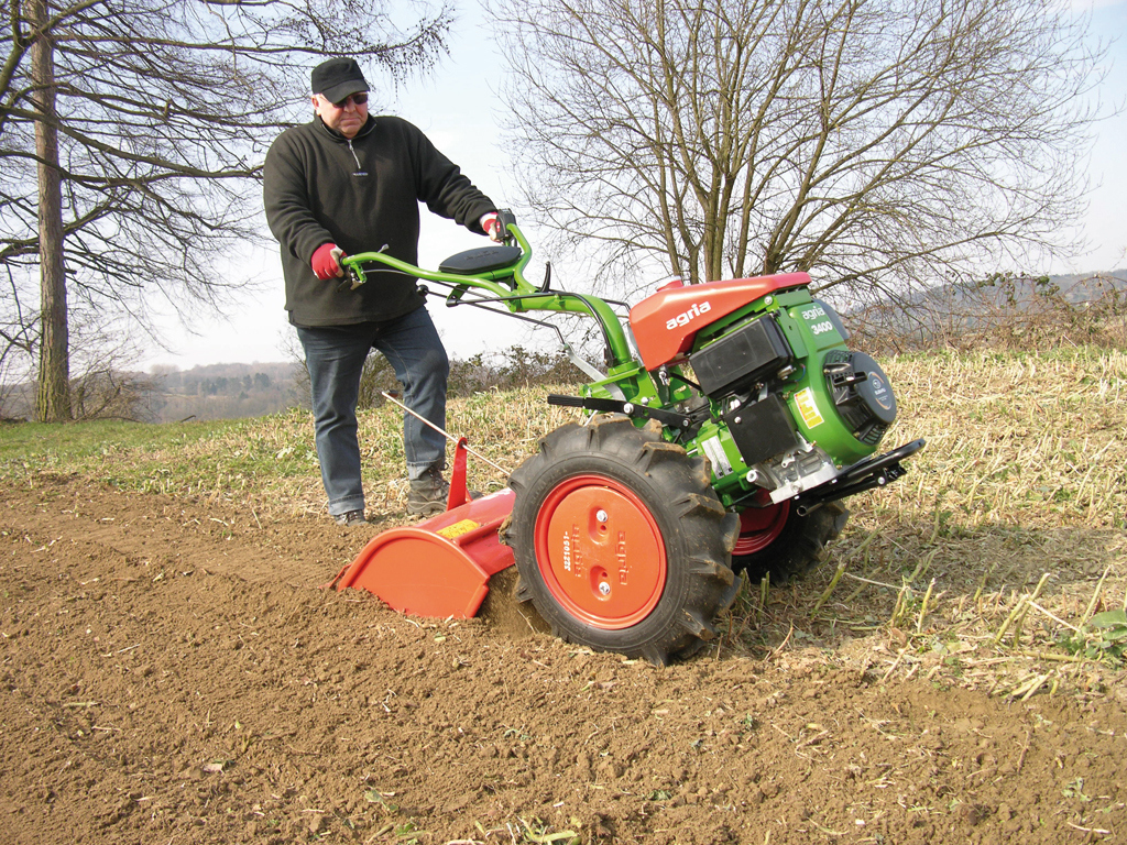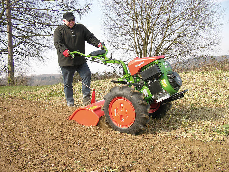 Wahlweise mit Dieseloder Benzinmotor kann der Anwender aus neun verschiedenen Modellen die für seine Bedürfnisse optimal ausgestattete Maschine finden. Der um 180° drehbare Lenkholm ermöglicht einen einfachen Wechsel zwischen Heck- und Frontanbau. Für die agria 3400 steht eine riesige Auswahl an unterschiedlichen Anbaugeräten zur Verfügung.