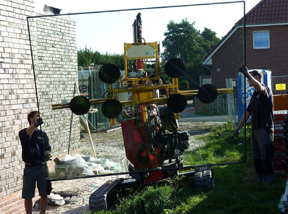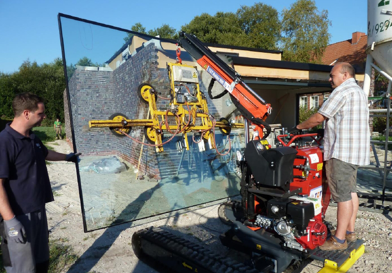 2,2 km/h und einem Eigengewicht von ca. 790 kg ist er vielseitig einsetzbar. Wie auf den Bildern zu sehen, bei der Montage im Fenster-, Glas- und Fassadenbereich.
