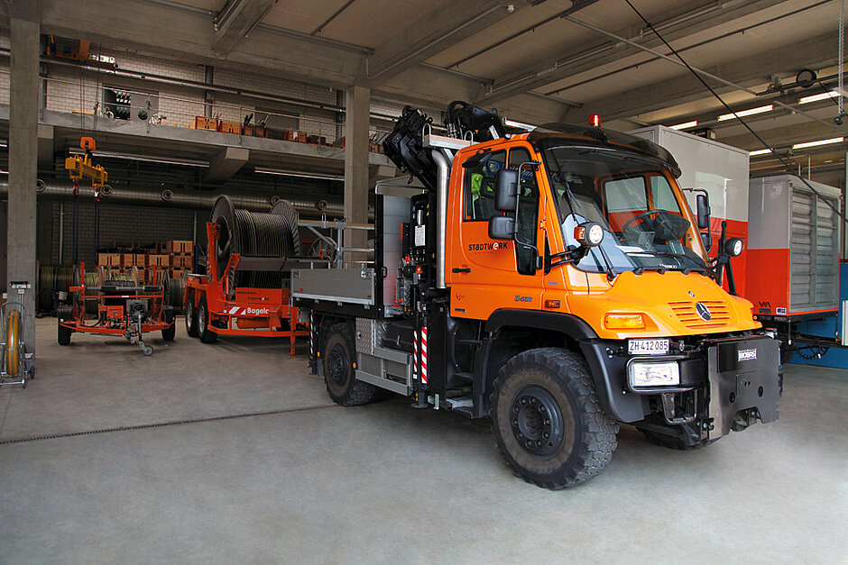Für den Einkauf ist Andreas Hiltbrunner zuständig, "Einkaufen mit Blick in die Zukunft" ist sein persönlicher Ehrgeiz und bei Ausschreibungen reizt er gerne das technisch Machbare aus. Manchmal, so sagt er, gebe es schlicht keine Alternative, weil nur ein Fahrzeug alle Anforderungen erfüllt. So zum Beispiel beim kompakten Unimog U 400 mit Allradantrieb und einer Zuglast von 18 Tonnen. Nur dieses Fahrzeug konnte das umfangreiche Pflichtenheft erfüllen. Und der neue U 400 mit Atlas Kran muss tatsächlich einiges leisten. Zu seinen Aufgaben zählen unter anderem das Verschieben und Rangieren der bis zu 18 Tonnen schweren Kabelanhänger, die Erdentnahme von schweren Kabeln oder der Winterdienst des Firmenareals mit dem Schneepflug.