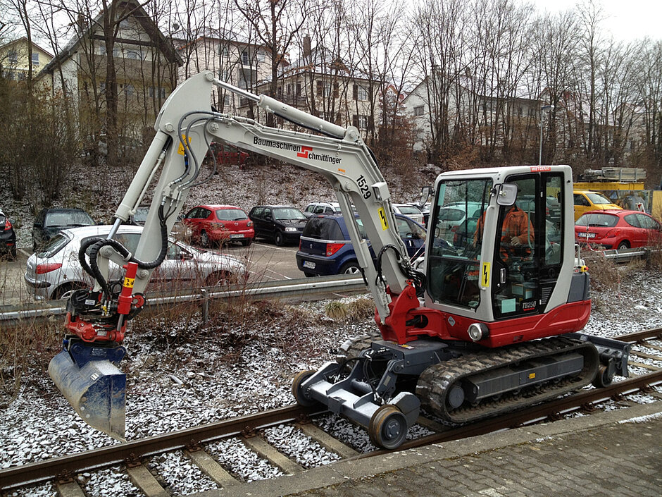 Die technische Ausrüstung des TB 250 wurde um ein Schienenfahrwerk erweitert. Dadurch ist er nun 75 cm länger und etwa 800 kg schwerer als das ursprüngliche Modell. Der TB 250 wird hydraulisch angehoben und auf die jeweilige Schiene gesetzt. Auch der Antrieb auf den Schienen sowohl vorwärts als auch rückwärts erfolgt hydraulisch. Die technische Erweiterung auf die Zweiwege-Variante fand in Regie des Generalimporteurs von Takeuchi, der Wilhelm Schäfer GmbH aus Mannheim statt. Der Takeuchi TB 250 ist aktuell beim Umbau des Bahnhofs Marbach im Einsatz. Hier werden unter anderem die Bahnsteige behindertengerecht gestaltet. Gerade auch bei diesem Einsatz sind die Vorteile des Takeuchi Zweiwegebaggers offensichtlich. Mit seinen gut 5 t Einsatzgewicht ist er deutlich wendiger als die üblichen größeren Modelle. Zudem benötigt er weniger Platz, um arbeiten zu können. Auch unter betriebswirtschaftlichen Aspekten zeigt er sich wesentlich kostengünstiger. Das ergibt sich logischerweise aus der Maschinengröße. Denn sowohl Einstands- als auch Betriebskosten bewegen sich auf einem deutlich günstigeren Niveau als bei einem größeren Bagger. All diese Vorteile haben den Gleisbauer bewogen, dieses im Vergleich zu den bisher im Einsatz befindlichen Zweiwegebaggern deutlich kleinere Modell von Takeuchi zu nutzen.