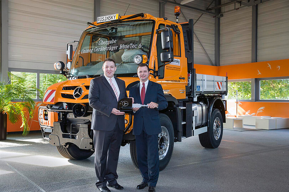 Der erste Unimog Euro VI wurde jetzt im Produktionswerk in Wörth am Rhein an seinen neuen Besitzer in Winsen/Aller übergeben. Es handelt sich um einen Unimog U 423 in kommunalorange mit 170 kW (231 PS), der nun in Diensten der Rosinsky Dienstleistungs GmbH steht. Eingesetzt wird das Fahrzeug für den Winterdienst im Auftrag von niedersächsischen Kommunen. Außerhalb der kalten Jahreszeit werden Schneepflug und Salzstreugerät abmontiert und durch eine „Bankettbaueinheit“ ersetzt. Mit ihrer Hilfe baut der Unimog am Rand neuer Straßen ein Bankett ein, indem er Schotter oder Erde einbringt und diese verdichtet. Dazu ist er im Auftrag von Kommunen und Straßenbaufirmen bundesweit im Einsatz.