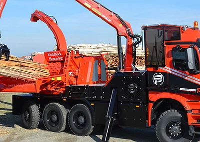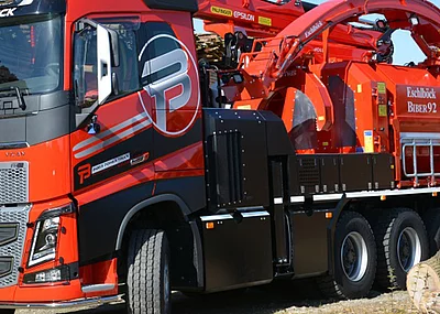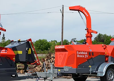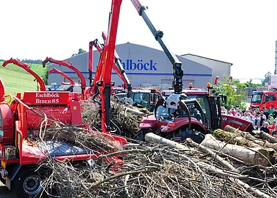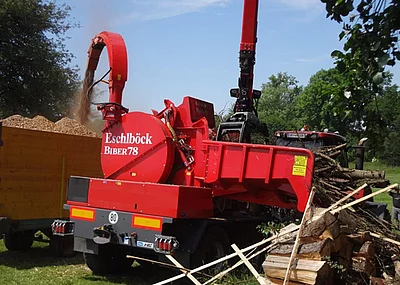 Eschlböck blickt auf eine jahrzehntelange Erfahrung im Hackerbau, sowohl in der Scheibenrad- als auch in der Trommelhackertechnologie zurück. Derzeit ist das neueste Modell Biber 92 RBZ des österreichischen Herstellers im Allgäu unterwegs G30 oder wahlweise G50 Hackgut zu erzeugen.