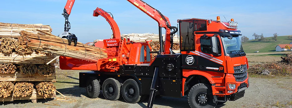 Der Magnet am Stand der Firma Eschlböck war der im Sommer angekündigte neue Turox aus der neuen Biber Power Truck Produktlinie. Mit einem speziell konzipierten Abtriebsgetriebe, das zwischen Fahrzeugmotor und Getriebe geflanscht ist, kann die volle Leistung vom 630 PS starken Mercedesfahrzeugmotor auf den Hacker gebracht werden. Der leistungsstarke Hacker ist mit 80 km/h Fahrgeschwindigkeit auf Autobahnen unterwegs und mit 8x8 Tridem Antrieb unschlagbar geländegängig mit extremen Böschungs- und Neigungswinkeln. Steigungen bis 60 Prozent und Querneigungen bis zu 30 Prozent sind möglich. Die kompakte Bauweise mit kurzem Radstand ermöglicht enge Wenderadien. Das Spezialfahrzeug ist mit einem neuen größeren Kran (Epsilon S110F) ausgestattet und hat 32 Tonnen Gesamtgewicht. Komfort und gute Sicht wurden mit der neuen Kabine nochmals optimiert. Die luxuriös ausgestattete Fahrzeugkabine bietet einen großzügigen optimal klimatisierten Arbeitsraum. Die hohe Sitzposition ermöglicht eine gute Sicht in den Einzugsbereich zu den Einzugswerkzeugen und in die Hackumgebung. Das Fahrzeug ist vom Bediensitz aus, auch während des Hackens, verfahrbar. Die intuitive Steuerung Best Control ermöglicht individuelle Einstellungen, entlastet den Bediener und ermöglicht auch damit dauerhaft hohe Durchsatzmengen.