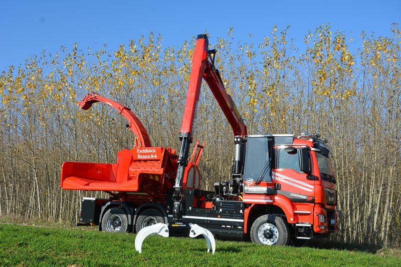MAROX, das neueste Modell von Eschlböck mit der energieeffizienten Biber-Powertruck Technik ist nach Herstellerangaben der erste Hacker am Markt, der mit der neuen EURO-6d-Motorengeneration auf MAN-Basis ausgerüstet ist. 510 PS und 2600 Nm Drehmoment lassen auf höchste Leistungswerte im Hackbetrieb schließen. Der neue MAROX besteche durch seine Geländetauglichkeit mit der 6 x 6-Achskonfiguration, dem Zwölf-Gang-Automatikgetriebe und dem Fahren und Hacken vom Bedienplatz aus.