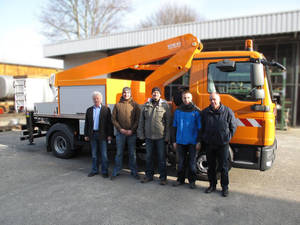 Die Wartung der Straßenbeleuchtung der Stadt Jena und die Montage von energieeffizienter Straßenbeleuchtung sind Schwerpunkt des Einsatzes der neuen Hubarbeitsbühne. Unser Bild zeigt Peter Skibbe, Andreas Hegt, Mario Brumme, Andreas Hadasch vom KSJ und ESDA Mitarbeiter Thomas Braun bei der Übergabe.