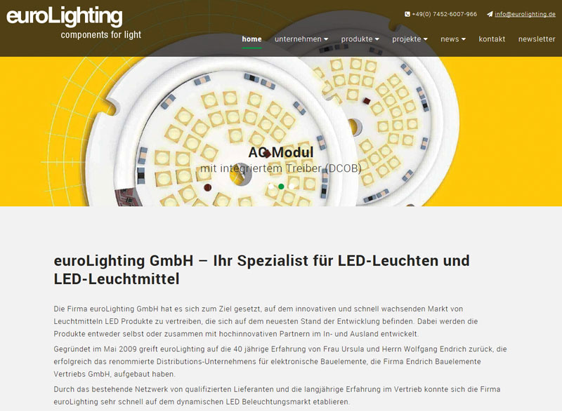 „Wir haben unsere Webseite auf den neuesten Stand der Technik gebracht. Besonders wichtig war uns, sie extrem nutzerfreundlich zu gestalten, sodass sich jeder einfach und schnell orientieren kann“, erklärt Wolfgang Endrich, Geschäftsführer euroLighting. Eine klare, übersichtliche Struktur und Navigation bietet Besuchern die Möglichkeit, sich ohne Umwege über die verschiedenen Produktkategorien zu informieren. Dazu zählen die treiberlose AC-Technik, Außen- und Straßenleuchten, LED-Leuchtmittel und Projektbeleuchtung sowie kundenspezifische LED-Module mit ihren wichtigsten Features und Vorteilen. Hier lassen sich auch direkt Produktkataloge und Datenblätter runterladen. Außerdem findet sich auf der Webseite alles Wissenswerte über das Unternehmen und seine Dienstleistungen. Die Projekte, die euroLighting bereits mit seinen LED-Produkten umgesetzt hat, listet ein extra Reiter auf anschauliche Weise. Und ganz neu: Unter News können Besucher nun aktuelle Fachartikel und Pressemitteilungen lesen und sich über Produktneuheiten, interessante Serviceleistungen sowie Ereignisse und Events von euroLighting auf dem Laufenden halten. Die neue Webseite wurde auch für mobile Endgeräte optimiert.