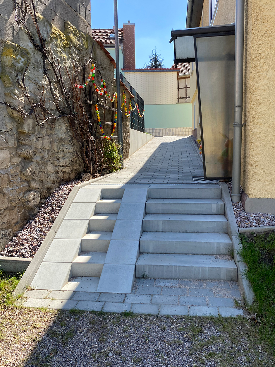 Klassische Blockstufen bietet der hessische Betonwarenhersteller mit gestrahlter Oberfläche in den Farben Granit und Basalt an, wahlweise mit oder ohne Untertritt. Die Variante mit unbearbeiteter Oberfläche ist mit Untertritt in Grau und Dunkelgrau, ohne Untertritt zusätzlich auch in Erdbraun erhältlich. Für einen dreiseitigen Treppenaufbau sind Blockstufen auch als Eckelemente mit 90 bzw. 135-Grad-Winkel lieferbar. Spezielle Radienblockstufen erlauben zudem abgerundete Treppenformen. Darüber hinaus stehen Sonderlösungen wie etwa Kinderwagentreppen als Kombination aus Stufen und Rampe zur Verfügung.