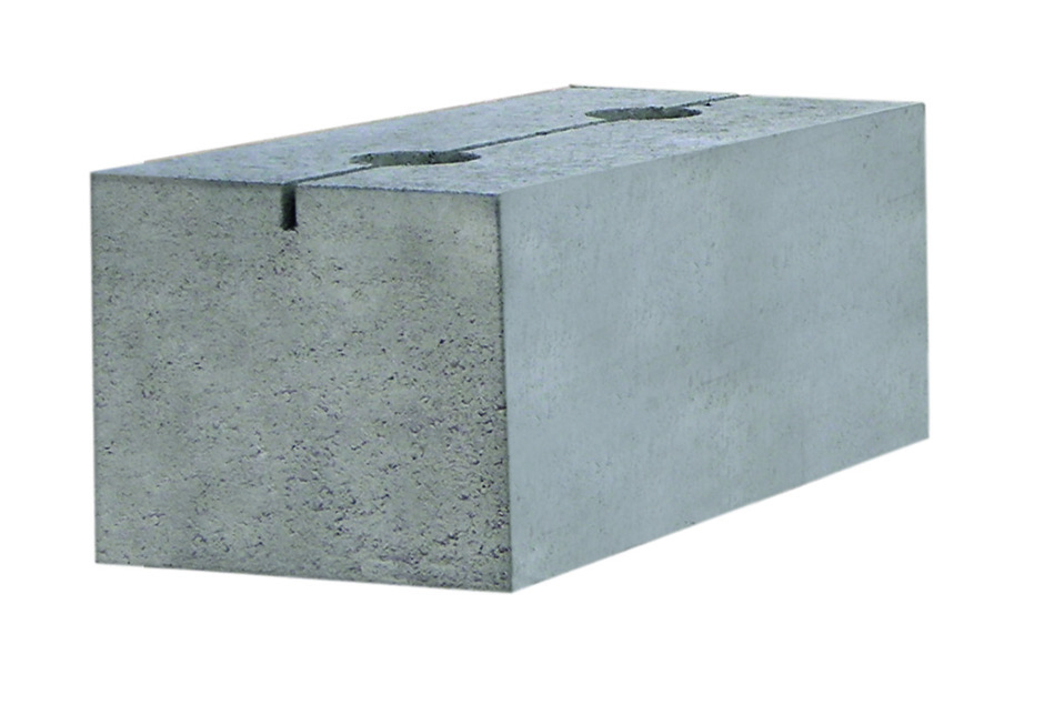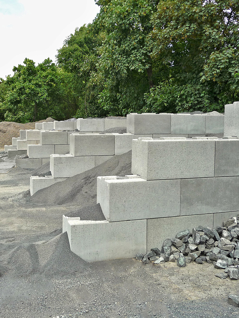 Für schwere Materialien und erweiterte Füllhöhen bietet FCN den Schwergewichts-Stein an, der im Raster 0,6 mit Hilfe eines Mobilbaggers zu versetzen ist. Mit drei Steinformaten im Verbundsatz lässt sich jede gewünschte Wandform realisieren. Zur Stabilisierung werden jeweils zwei Steinlagen mittels einer 15er-Rundpalisade aus Beton verbunden, die durch eine Aussparung in der Steinmitte geführt werden. Auf diese Weise ergibt sich kein Montageversatz. Sondermodule für Ecken oder eine Bodenverankerung werden nicht benötigt.
