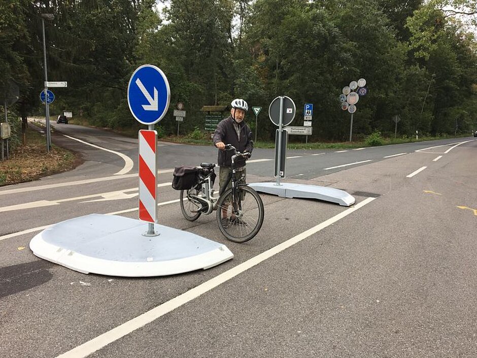Einfach aufgelegt, mit drei Bodenverankerungen pro Inselelement fixiert und über die Klemmhülse beschildert können die Elemente aus massivem Kunststoff Recycling binnen kurzer Zeit installiert werden. Die Auflage findet auch bei dieser Insel nur am Rand statt, so dass Fahrbahnunebenheiten größtenteils aufgefangen werden.