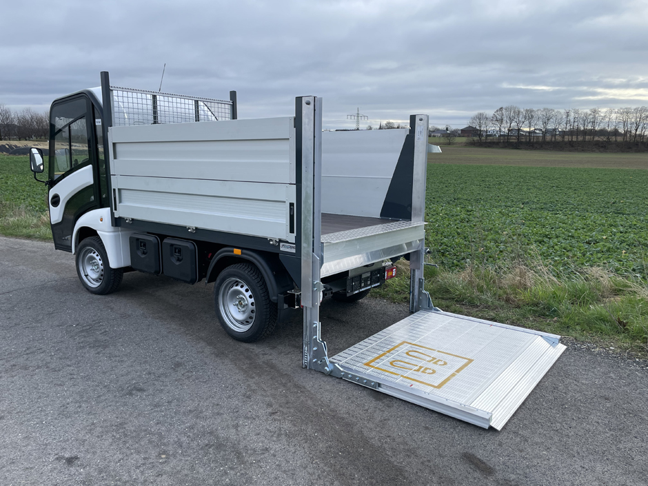 Ergänzend kann der Vertikallift an das Heck der Pritsche montiert werden. Er bietet einen entscheidenden Vorteil beim Be- und Entladen von rollbaren Gütern oder Palettenwaren. Die Bedienung erfolgt intuitiv mittels Fernbedienung. Betrieben wird das elektrohydraulische System über eine separate Lastbatterie und ist damit unabhängig von der Fahrzeugbatterie.