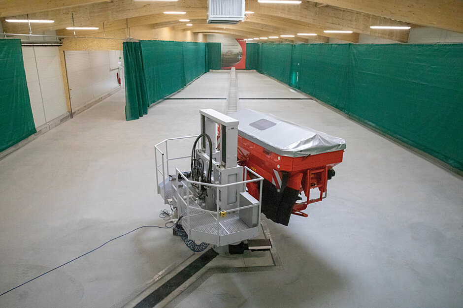Mit einer Investitionssumme von knapp 2,5 Millionen ist am Baden Airpark die modernste Testhalle Europas entstanden. Allein der Streuraum der vollklimatisierten Halle umfasst eine Fläche von fast 1.235 qm, die Arbeitsbreiten von bis zu 75 m ermöglicht. 88 Auffangschalen mit vollautomatischen Hochgeschwindigkeits-Wiegezellen garantieren sehr schnelle und absolut präzise Ergebnisse für alle verfügbaren RAUCH Düngerstreuer-Modelle sowie für zukünftige Neuentwicklungen.