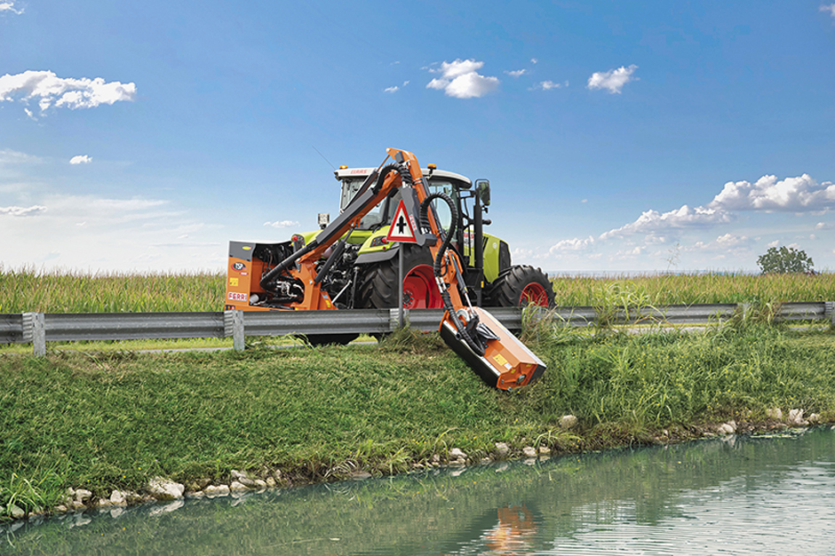 Zwei weitere Funktionen wurden realisiert, um die Arbeitseffizienz zu verbessern und dem Bediener ein komfortables und sicheres Arbeiten zu ermöglichen, wodurch Stress reduziert und die Leistung gesteigert wird. Die LFA-Funktion (Lift Float Accumulator) – serienmäßig bei vielen FERRI-Böschungsmähern, inklusive des neuen TSP-Modells – ermöglicht die Aktivierung einer zusätzlichen hydraulischen Federung am ersten Arm mittels Stickstoffspeicher direkt vom Display in der Kabine aus. Der Mähkopf „schwebt“ dank der LFA-Funktion leichter über dem Boden und erhöht die Produktivität. Bei den Modellen TKD, TKZ, TSP und TSH ist die Funktion SAB (Automatic Anti Rollover System) serienmäßig verbaut und mit einem Elektroantrieb ausgestattet. Sie verhindert, dass der erste Arm eine Drehung von mehr als 90 Grad in einer vertikalen Position überschreitet, wodurch maximale Bedienersicherheit gewährleistet ist und die vollständige Funktionalität der Maschine erhalten bleibt. Diese Funktion ermöglicht es dem Bediener, auch bei maximaler Streckung der Arme vertikal zu arbeiten und Äste sicher und komfortabel zu kappen.