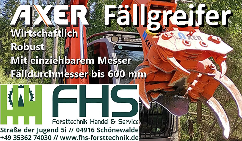 Die Generalvertretung der Fällgreifer hat die Firma FHS Forsttechnik Handel und Service GmbH mit Sitz im brandenburgischen Schönewalde inne. Geschäftsführer Wolfram Jähnichen sagt: „Wir merken, dass die Nachfrage der Axer-Fällgreifer immer größer wird und bekommen super Feedback von unseren Kunden. Daher wollen wir den Vertrieb in Zukunft weiter ausbauen und die Kunden von diesen robusten und auch wirtschaftlichen Fällgreifern überzeugen. Wir wollen in Deutschland denselben Status erreichen, wie bereits in den skandinavischen Ländern. Dort sind Axer Fällgreifer bereits ein Begriff, der für Langlebigkeit und Robustheit steht.“