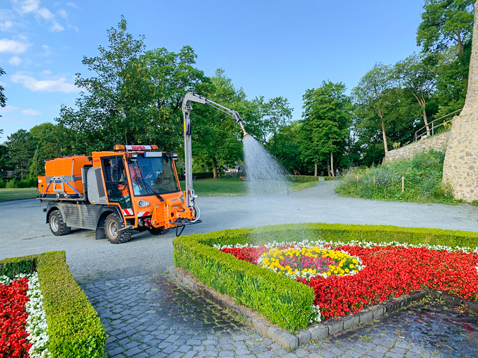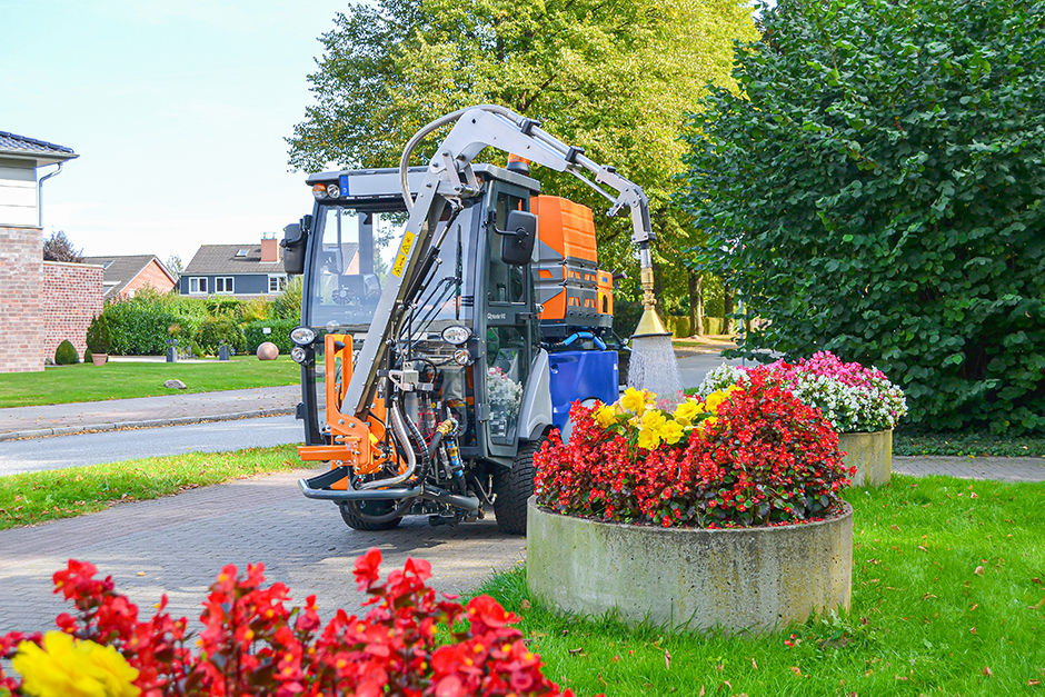 Der Schwenkbereich vor dem Fahrzeug liegt bei 270 Grad, es können somit auch Bereiche direkt neben der Fahrer- und Beifahrertür erreicht werden. Durch eine innovative Schwenkbewegung über eine spezielle Getriebe-Gelenk-Anordnung regelt sich die Position des Gießkopfes immer vollautomatisch. Bedient wird die Anlage über die bereits mehrfach ausgezeichnete FMC-Steuerung. Mit dieser können sämtliche Funktionen direkt gesteuert werden. So lässt sich z.B. die Litermenge pro Minute oder pro Einzelabgabe (für z.B. Anpflanzungen) individuell einstellen. Mittels integriertem GPS-System können diese Informationen direkt erfasst und dokumentiert werden.