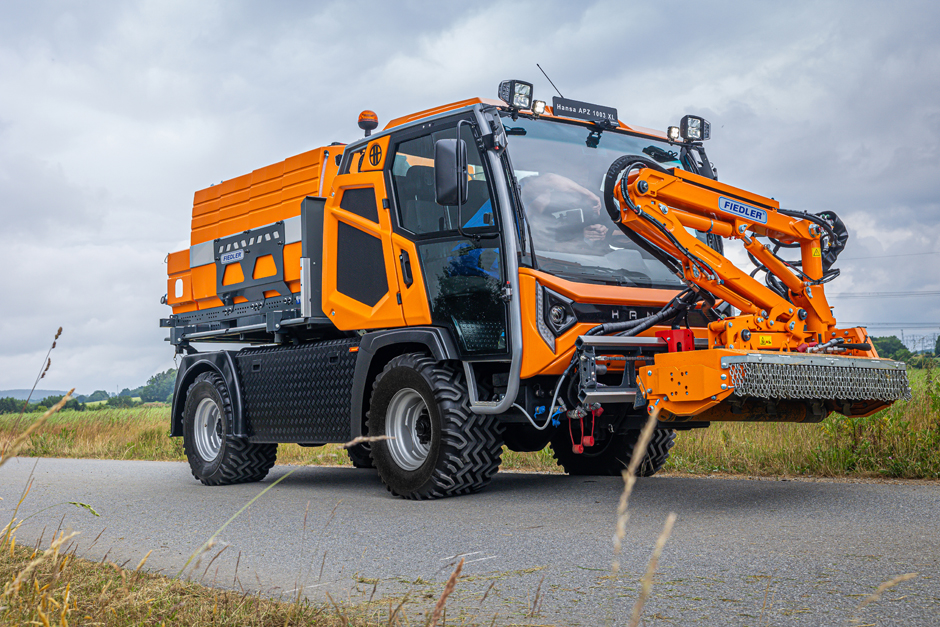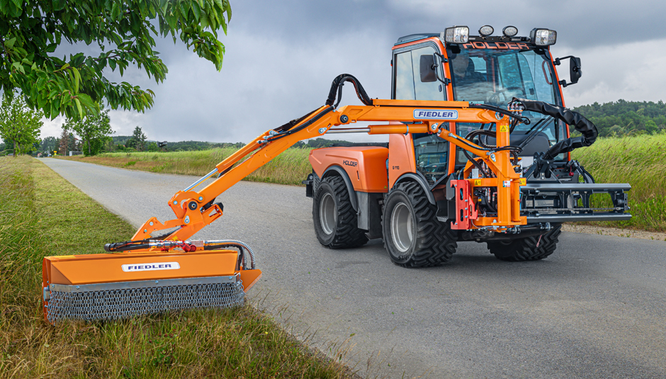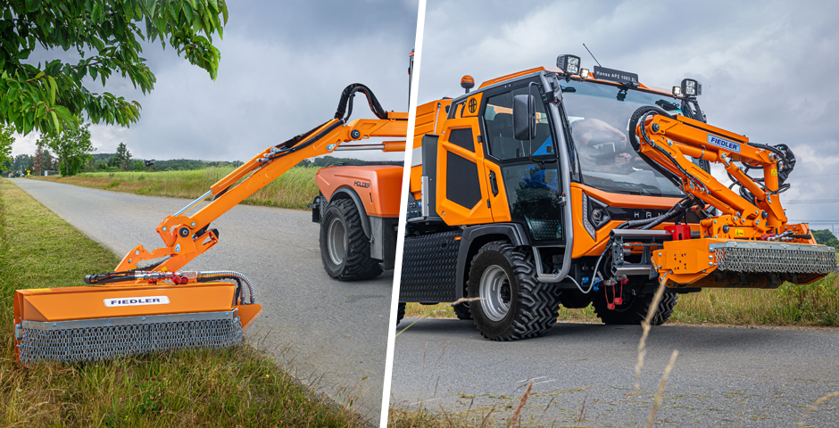 Die maximale Auslageweite ab Fahrzeugmitte beträgt circa 4,65 Meter beim Arbeiten mit dem Flachmähkopf FFMK 1250. Rechts- oder Linksarbeit ist wie bei allen Frontauslegern möglich, die Umbauzeit hierfür liegt unter fünf Minuten. Für Sicherheit sorgt die beidseitig wirkende hydraulische Anfahrsicherung (je 30 Grad) mit Gasfederspeichern und selbsttätiger Rückstellung.