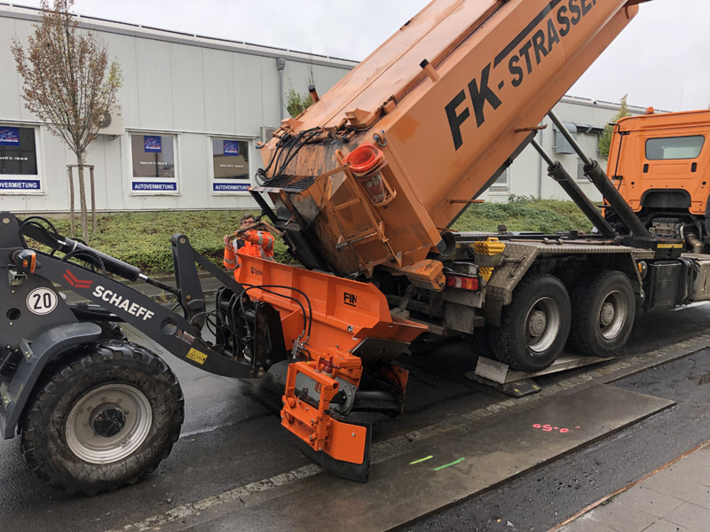 Auch der heiße Asphalt wird von der „Finliner“ problemlos bewältigt. „Man muss darauf achten, genügend Trennmittel zu verwenden. Dann läuft das einwandfrei“, berichtet Klug. Wenn zum Beispiel nur Bankette mit Mineralmischungen verfüllt werden, hat man schon Strecken von etwa 2.000 m pro Tag geschafft. Das hohe Tempo, mit dem gearbeitet werden kann, ist möglich, weil man sich immer parallel zu der zu verfüllenden Strecke bewegen kann. Das steht im Gegensatz zu der früheren Einsatzmethode, bei der mit Bagger oder Radlader gearbeitet wurde. Damals musste man immer wieder für jeden Meter quasi neu anfahren. Diese ganzen Lenk- und Fahrbewegungen plus die permanente Materialaufnahme fallen nun weg.