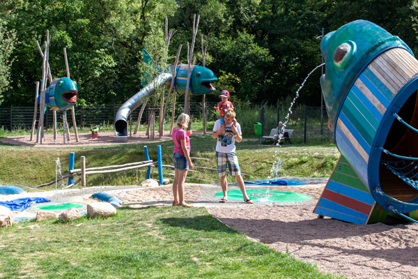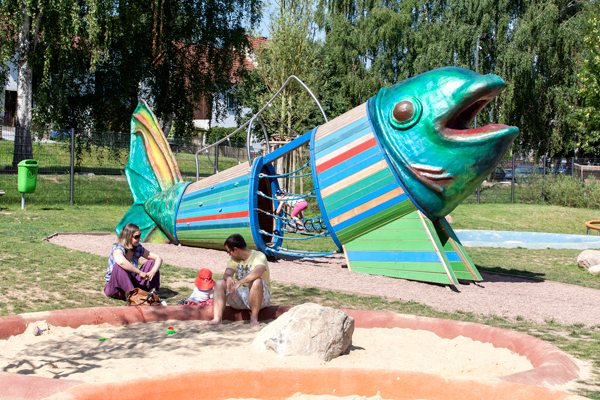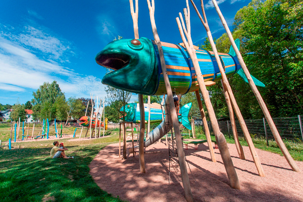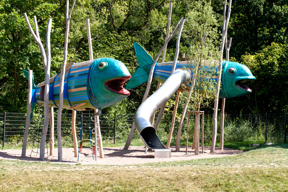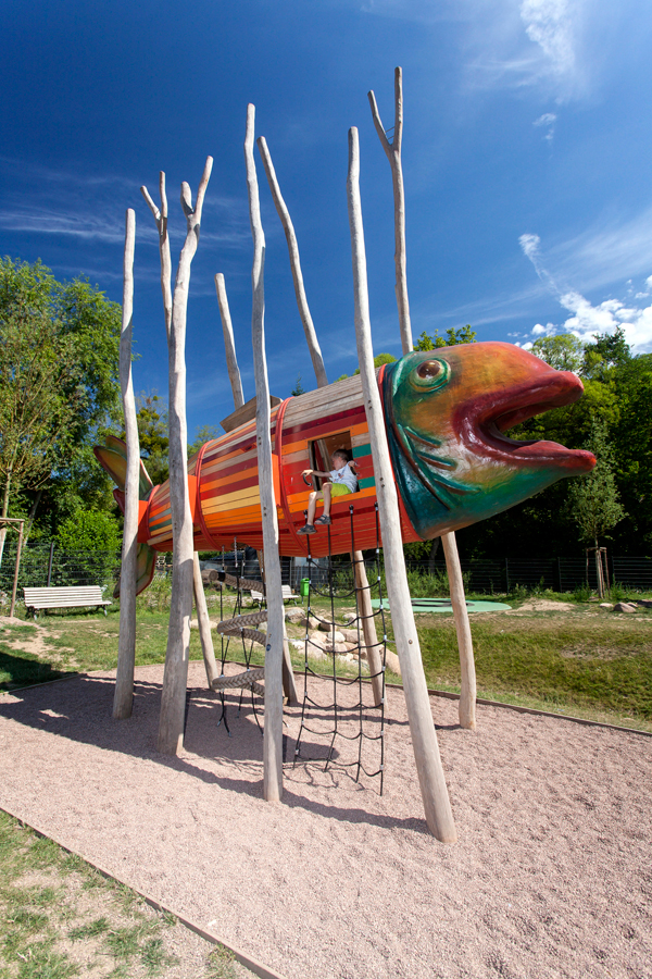 Die bekletterbaren Zwischenelemente wurden aus Eichenholz gefertigt und mit den Kopf- und Schwanzteilen verbunden. Nicht nur das äußere Erscheinungsbild ist ein Highlight. Die vielfältigen Spiel- und Kletterelemente im Innenraum, wie zum Beispiel Gummimatten, Zehrspiegel und Rechenschieber, erhöhen den Spielwert. Eine weitere Fischskulptur wurde am Boden montiert und mit einer Wasserdüse ausgestattet. Über eine Steuerung, mit festgelegtem Zeitfenster, erfolgt das Wasserspiel überraschend und unerwartet.
