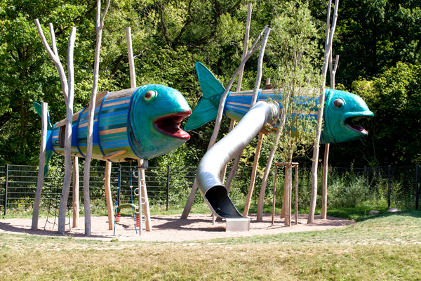 Riesige Fischskulpturen hängen hoch oben an hölzernen Stelzen. Es hat den Anschein, als liegen die Fische „in den Bäumen“. Die Idee kam den Landschaftsarchitekten von K1 aufgrund des Stadtwappens von Waltershausen, welches einen Fisch in drei Bäumen zeigt.
