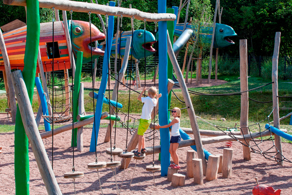 Balancier- und Kletterparcours aus Robinienrundholz, gespickt mit maritimen Schnitzereien, Hängematte und Nestschaukel sowie div. Wipp- und Wackelgeräte vervollständigen diesen außergewöhnlichen Spielplatz und bietet viel Raum für Fantasie und ausgelassenes Toben.