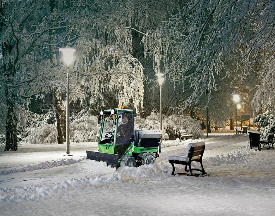 In den Wintermonaten, aber auch in den anderen Jahreszeiten, ist der Park Ranger 2150 eine effiziente, multifunktionale Rundum-Lösung. Das Besondere: Je nach Anbaugerät wandelt sich der Geräteträger zum absoluten Spezialisten für die jeweilige Tätigkeit. Insgesamt 14, auf eine bestimmte Aufgabe zugeschnittene Anbaugeräte lassen sich in weniger als vier Minuten montieren und auswechseln – und das völlig ohne Werkzeug. Salz- und Kiesstreugerät, Schneefräse und Schneeräumschild gehören hier zur Standardausstattung für den Winterdienst. Doch auch die klassische Frontkehrmaschine lässt sich effektiv zur Entfernung des ersten Schneefalls einsetzen. Durch diese Auswahl meistert die Maschine sämtliche Herausforderungen. Dank kompakter Maße von 222 x 101 x 193 Zentimetern (Länge, Breite, Höhe) und einem Wenderadius von 1,5 Metern eignet sich das Fahrzeug im Winterdienst zudem besonders für das Schneeräumen auf Radwegen, Gehsteigen und anderen beengten Flächen. Da bereits im Frühjahr 2020 der Antrieb des Park Rangers 2150 auf einen Abgasnorm-EU-Stage-V-konformen Motor umgerüstet wurde, arbeitet das Geräteträgersystem zudem so wirtschaftlich und umweltschonend wie nie zuvor.
