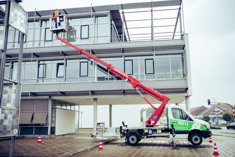 LKW-Arbeitsbühnen werden häufig an Einsatzobjekten in Innenstädten und/oder Parkanlagen eingesetzt. Sensible Passanten beklagen dabei häufig den laufenden Fahrzeugmotor, der im Normalfall nötig ist, um die Arbeitsbühne anzutreiben. Mit dem neuen ECOLINE Hybrid-Antrieb können die Modelle mit 16 m und 18 m jetzt geräuscharm sowie CO2- und abgasfrei betrieben werden.