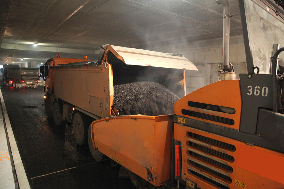 Zudem ist eine Reduzierung der Temperatur im Herstellprozess möglich, sofern der Asphalt mit Abschiebetechnik ausgebracht wird – natürlich ohne, dass die Asphaltqualität darunter leidet. Denn anders als beim Kipper rutschen die verschieden temperierten Asphaltschichten eben nicht getrennt in den Fertiger, sondern homogen und mit gleichmäßig hoher Temperatur während des gesamten Abladevorgangs. Temperaturschwankungen hinter der Bohle werden effektiv minimiert, wodurch der Asphalt gut verdichtbar ist und gleichmäßig eingebaut werden kann. Das Ergebnis ist eine wesentlich bessere Einbauqualität und somit auch eine längere Haltbarkeit der Asphaltdecken. Fahrzeuge mit Abschiebetechnik, wie der Asphaltprofi Thermo von Fliegl, sind also nicht nur umweltfreundlich, sondern auch wirtschaftlich sinnvoll. Dies spiegelt sich unter anderem in der Instandhaltung wider. Durch den qualitativ höherwertigen Einbau kann eine längere Haltbarkeit der Asphaltschichten garantiert werden. Somit wird die Anzahl der Sanierungszyklen wesentlich reduziert. Mit dem Einsatz von thermoisolierten Abschiebewagen werden zugleich Geldbeutel und Umwelt geschont. Durch den kontinuierlichen Abschiebeprozess wird Stop and Go vermieden und deutlich mehr Laufmeter sind möglich. Zudem ist die Abschiebefunktion eine intelligente Lösung bei schwierigen Einbausituationen. Bäume, Oberleitungen, Brücken und Tunnel stellen kein Problem dar. Das Abladen funktioniert auch in Raumhöhen, in denen Kipper an ihre Grenzen stoßen. Abzuschieben statt (um)zukippen bedeutet außerdem generell mehr Sicherheit und ein besseres Fahrverhalten.