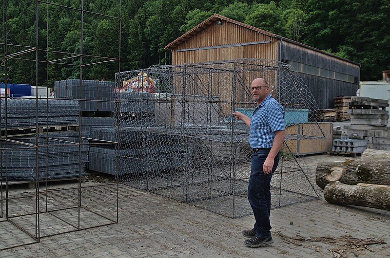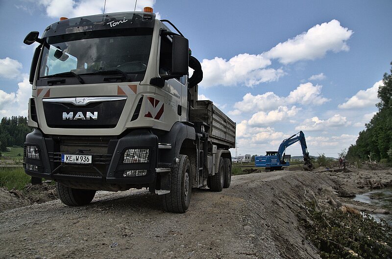 Der Hündeleskopf im Allgäu. Wo gerade noch die Sommersonne am Berg schien, ziehen über der Straße zum Gipfel dunkle Wolken auf. Schnell verstärkt sich der beginnende Regen, bis Hagelkörner auf das Dach des Geländewagens prasseln, der vor einer Kurve Halt macht. Gerhard Mayer, Leiter der Flussmeisterei Füssen, steigt aus und schreitet in einer grün-blauen Regenjacke zu der Baustelle, die seine Leute bearbeiten. Der Grund für den Einsatz, für den die Mitarbeiter einen Schreitbagger hier herauftransportiert haben, wird schnell klar, als ein Strom Regenwasser den Berg herunter und auf die Kurve zuschießt. „Wenn das so weitergeht, spült uns das die Straßenränder herunter, deswegen verstärken wir hier“, erklärt er und verweist auf die Konstruktion aus Holzbalken, die an der Bergflanke angebracht ist. Schnell begibt er sich zu seinen Kollegen, die in einem nahen Transporter Zuflucht vor den Elementen gesucht haben. Ein paar Arbeitsanweisungen werden ausgetauscht, dann kehrt er zurück, und die Reise geht weiter zur nächsten Baustelle.