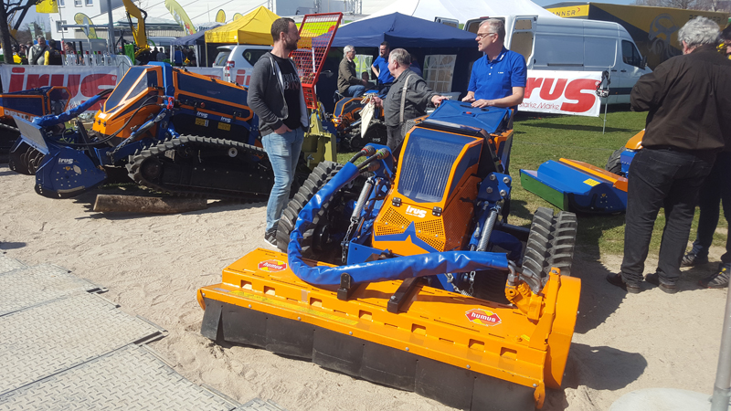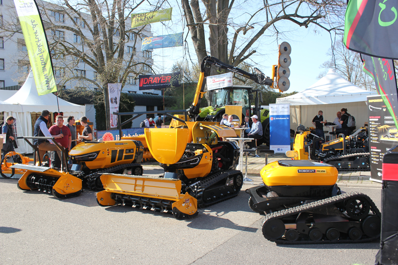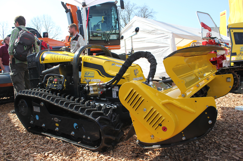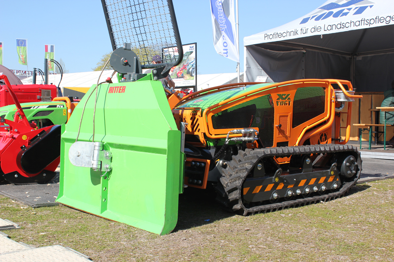 Ein ganzes Stück weiter, auf dem Freigelände Mitte, ballt sich das Angebot an Herstellern von funkferngesteuerten Geräteträgern. Die Vogt GmbH präsentiert hier einen Querschnitt durch ihr umfangreiches Produktrepertoire an MDB Green Climber, das von der LV 300 mit 25 PS bis hin zur LV 800 mit 75 PS reicht. Auch das Unternehmen Irus ist mit seinen Modellen EVOTRAK, QUATRAK, DELTRAK sowie TWIN vertreten. Hier kann der Besucher zwischen Leistungen von 30 bis 75 PS wählen. Schräg gegenüber, am Stand von Energreen, wird der neue RoboGreen evo (40 PS) noch von einem Tuch verdeckt. Nur ein paar Minuten später feiert er dann endlich seine Premiere. Zwischen den RoboGreen-Modellen, die bis 1. Januar 2019 unter dem Namen Robocut durch McConnel vertrieben wurden, und den RoboGreen-Modellen von Energreen, bestehe keine Verbindung mehr, berichtet Verkaufsberater René Birkefeld. Der neue RoboGreen evo wurde deshalb auch an einigen Stellen überarbeitet. „Er hat ein neues Kleid bekommen“, sagt Birkefeld. Zudem sei den Kunden der Vorgänger seitlich zu weit offen gewesen. Mit der neuen, geschlossenen Verkleidung ist der RoboGreen evo nun gänzlich vor dem Eindringen von Gestrüpp geschützt. „Und die Maschine hat jetzt auch ein Fronthubwerk mit mechanischer Schnellkupplung für verschiedene Anbaugeräte“, berichtet Birkefeld.