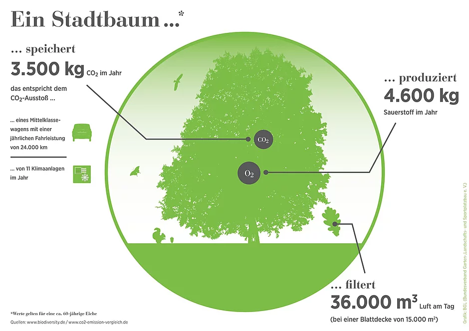 Dabei seien Bäume und Sträucher ein elementarer Bestandteil für ein besseres Stadtklima: „Bäume reduzieren die Feinstaubbelastung, bauen Kohlendioxid ab und sind der zentrale Sauerstoffproduzent.“ Eine 60-jährige Eiche in einem Stadtpark speichert 3.500 kg CO2 im Jahr, das entspricht laut Helmholtz-Zentrum für Umweltforschung (www.biodiversity.de) dem CO2-Ausstoß eines Mittelklassewagens mit einer jährlichen Fahrleistung von 24.000 km.