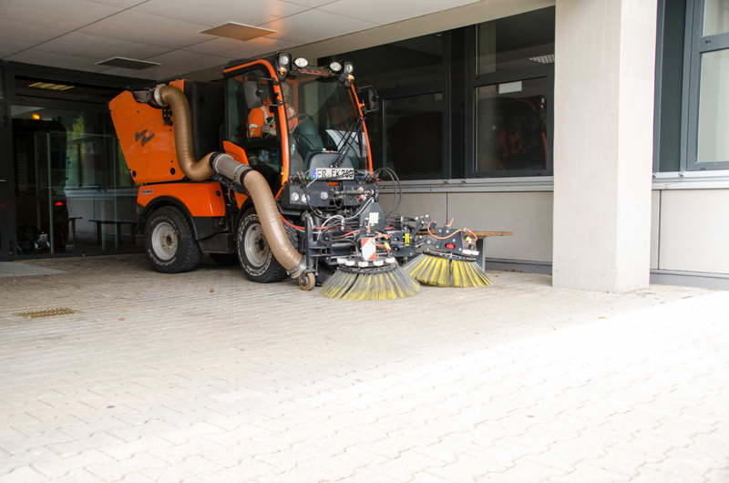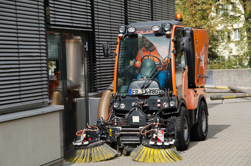 Am späten Nachmittag verlassen die letzten Schüler das Gelände des Droste-Hülshof-Gymnasiums im Freiburger Stadtteil Herdern. An der Zufahrt steht Branko Sestak mit seinem Holder C 250 und blinkendem Warnlicht bereits auf Startposition. Gleich wird der FeSo-Mitarbeiter das Kehrfahrzeug mit spielerischer Leichtigkeit und einem unsichtbaren Fahrplan folgend über das weitläufige Areal aus Wegen und Plätzen steuern. Der Holder C 250 ist mit der Easy Clean Kehr-Saugkombination von Kugelmann ausgerüstet: Ein frontseitiges Anbaugerät mit zwei rotierenden, horizontal wie vertikal beweglichen Bürsten, inklusive Ansaugeinheit und einem huckepack mitgeführten Sammelbehälter.