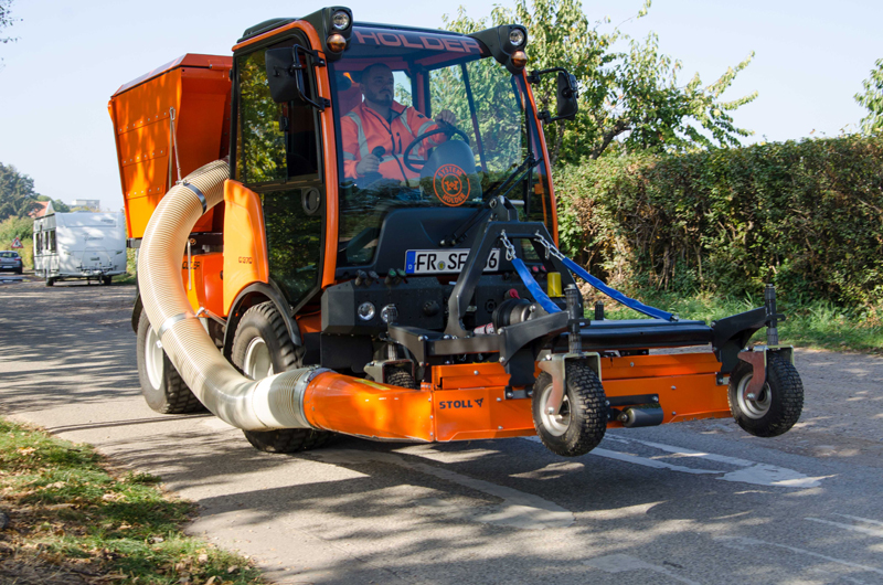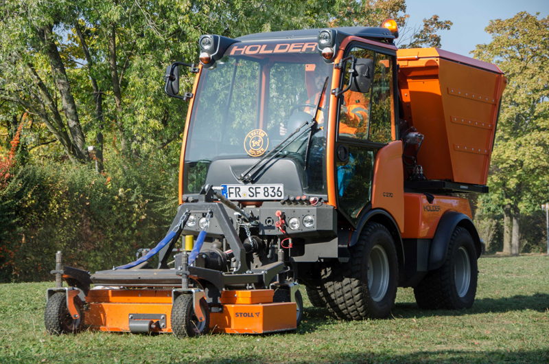 Edis Ferhati ist dem Rat gefolgt: „Mit Reiko und Herrn Saladin verbindet mich eine sehr vertrauensvolle und persönliche Partnerschaft. Ich weiß, dass ich in jeder Situation kompetente Unterstützung und im Notfall rasche Hilfe oder ein vergleichbares Ersatzfahrzeug erhalte“, betont Edis Ferhati. Im Kern entspricht der Holder C 370 dem C 250, hat jedoch mit 70 PS einen leistungsstärkeren Motor und anstatt einer Ein-Mann- eine Zwei-Mann-Kabine. Seit nunmehr einem Jahr im Einsatz, will Edis Ferhati das neue Gefährt nicht mehr missen: „Mit dem Holder C 370 und dem angebauten 4-fach-Sichelmäher kann ich Rasenflächen unterschiedlichster Art bearbeiten – vom Sportplatzrasen über hügelige Parkflächen bis zu kleinen, winkligen Rasenflächen entlang von Straßen und Plätzen“, sagt Edis Ferhati nicht ohne Stolz. Der Holder C 370 ist mit einem Mähwerk von Stoll und einer Saugeinheit von GMR ausgestattet. Zwei von mehreren Anbaugeräte-Herstellern, die bei Holder als Premiumpartner gelistet sind. Vier gleich große Räder sorgen für perfekte Traktion selbst in steilen Lagen.