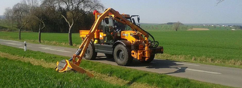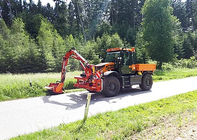 Aus der Arbeit in Kommunen sind leistungsstarke Geräteträger heute nicht mehr wegzudenken. Sie ermöglichen neben dem Transport von Schildern, Werkzeugen und Baumaterialien auch den Einsatz verschiedenster Anbaugeräte. Um dieses Spektrum zu erfüllen, müssen sie intelligent konstruiert sein. Der Fuß-Trac bietet beste Voraussetzungen: Angetrieben wird er von einem kraftvollen Deutz 4-Zylinder-Motor mit 115 kW Leistung. Bei einem zulässigen Gesamtgewicht von bis zu 13 Tonnen liegt die erlaubte Achslast bei 6,5 Tonnen auf der Vorder- und sogar bei bis zu 7 Tonnen auf der Hinterachse. Damit steht für Geräte und Ladung ein Spielraum von 3,5 Tonnen auf der Vorder- und bis zu 4,4 Tonnen auf der Hinterachse zur Verfügung. Die Bauweise des Fuß-Trac ist sehr kompakt. So bleibt selbst bei angebautem Frontgerät die Gesamtlänge von Lenkradstange bis zum vordersten Punkt des Fahrzeugs unter 3,50 Metern. Das bedeutet, dass keine weiteren Maßnahmen zur Verbesserung der Sicht des Fahrers notwendig sind.