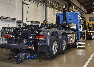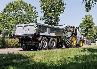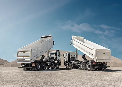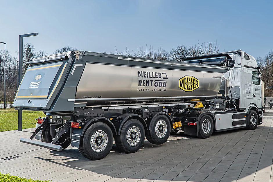 Ein niedriger Gesamtschwerpunkt des Aufbaus, kombiniert mit einer tiefergelegten Ladekante, erleichtert die Befüllung auf engem Raum. Beim Entladen sorgt eine abgesenkte Schüttkante für präzisen Materialfluss – eine nicht zu unterschätzende Hilfe bei sensiblen Asphaltarbeiten. Fahrwerk und Rahmen basieren auf einem torsionssteifen Trägerkonzept. Insgesamt setzt die Konstruktion auf ein ausgewogenes Verhältnis zwischen Gewicht und Stabilität. Durch den Einsatz von STEELECT garantiert MEILLER seinen Kunden die beste Stahlauswahl getroffen zu haben. Besonders beanspruchte Zonen, wie der hintere Muldenboden, bestehen aus Materialien, die die anspruchsvollen STEELECT-Gütekriterien erfüllen und somit mindestens eine Härte von 450 HBW aufweisen.