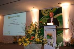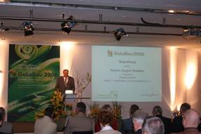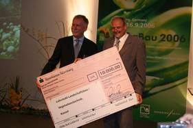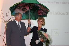 | Bernd A. Diederichs, Geschäftsführer der Messe Nürnberg GmbH bei der Überreichung des Förderschecks für den Lehrstuhl Landschaftsbau / Vegetationstechnik in Kassel an Treuhänder Hanns- Jürgen Redeker. | Festansprache und Eröffnung mit Dagmar Wöhrl, MdB Parlamentarische Staatssekretärin im BM für Wirtschaft und Technologie. |