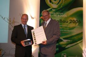 | Für Ihre auserordentlichen Verdienste um die grüne Umwelt, wurde die Allianz Umweltstiftung (München) mit der "Silbernen Landschaft" ausgezeichnet. v.l. Dr. Lutz Spandau, Vorstand der Allianz Umweltstiftung und Hanns- Jürgen Redeker | Antoine Berger, Präsident der Gemeinschaft des Europäischen Garten-, Landschafts- und Sportplatzbau bei seiner Laudatio für belgische Privatgärten mit dem Trendpreis "Bauen mit Grün". |