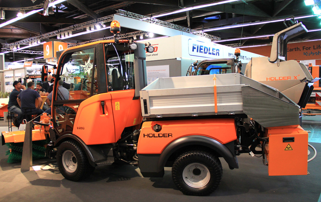 Eine Gesamthöhe von gerade einmal 1,98 Metern und dabei trotzdem kompakt und leistungsstark – das verspricht der neue Holder B 250. Als Einstiegsmodell schließt er damit die Lücke zwischen dem X 30 und der C-Reihe und bietet sich – so der Hersteller – besonders gut für den Einsatz in Tiefgaragen an. Die Motorleistung von 50 PS soll dafür sorgen, dass der B 250 auch im Straßenverkehr problemlos mithalten kann. Zusätzlich bietet die Kabine mit 360°-Rundumsicht dem Fahrer uneingeschränkte Sicht auf alle Anbaugeräte. Mit permanentem Allradantrieb, vier gleich großen Rädern, Radlastausgleich und mechanischer Differentialsperre verfügt der knickgelenkte Multifunktionsträger über die serienmäßigen Eigenschaften, die der Anwender bereits von anderen Holder-Produkten kennt.