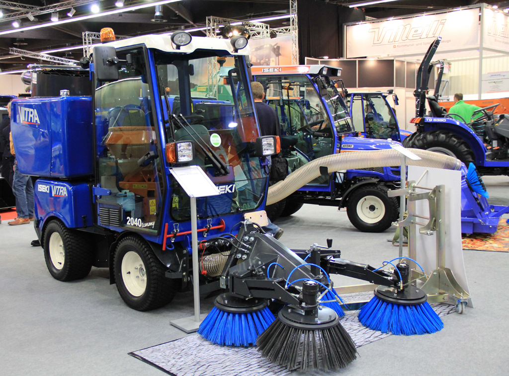 Eine überzeugende Feinstaubfilterung mit 60 Prozent weniger Wasserverbrauch als vergleichbare Maschinen – für dieses umweltfreundliche Alleinstellungsmerkmal erhielt die Iseki-Vitra 2040 Kehrsaug-Anlage zur Außenreinigung von Gehwegen, Hofflächen oder Parkplätzen die GaLaBau-Innovationsmedaille 2014, die vom Bundesverband Garten-, Landschafts- und Sportplatzbau e.V. (BGL) für neue und fortschrittliche Produkte verliehen wird. Die Schmutzaufnahme hat ein Volumen von 500 Litern, wird hydraulisch in 1,35 Metern Höhe entleert und soll auch ohne Filter nahezu staubfrei arbeiten. Der separate Behälter fasst zusätzlich über 70 Liter Wasser. Mit einem Radius von 1,8 Metern soll die vollhydraulisch angetriebene Maschine extrem wendig sein und kann – so Iseki – aufgrund ihrer geringen Außenbreite ab einem Meter, auch auf schmalen Gehwegen problemlos manövriert werden.