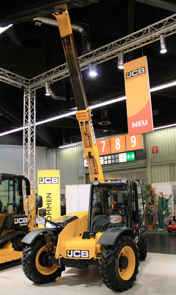 Auch bei JCB ist emissionsfreies Arbeiten ein großes Thema: der kompakte JCB Teleskoplader 525-60 mit nur 1,8 Metern Breite und 1,9 Metern Höhe sowie einer maximalen Hubhöhe von sechs Metern wird vom neuen JCB Diesel by Kohler-4-Zylinder-Motor mit 2,5 Litern und 55 kW (74 PS) angetrieben, der die Tier 4 Final-Abgasbestimmungen einhält – laut JCB ganz ohne Dieselpartikelfilter oder SCR-System. Durch seinen hocheffizienten und sauberen Verbrennungsprozess soll der Motor extrem niedrige Emissionswerte erreichen. Daneben bietet eine geräumige und vollausgestattete Kabine dem Fahrer freie Sicht über den Ausleger, nach hinten sowie über die Vorderräder oder Anbaugeräte. Der Einhebel-Servo-Joystick ermöglicht nach Angaben des Herstellers eine präzise und feinfühlige Steuerung der Maschine.