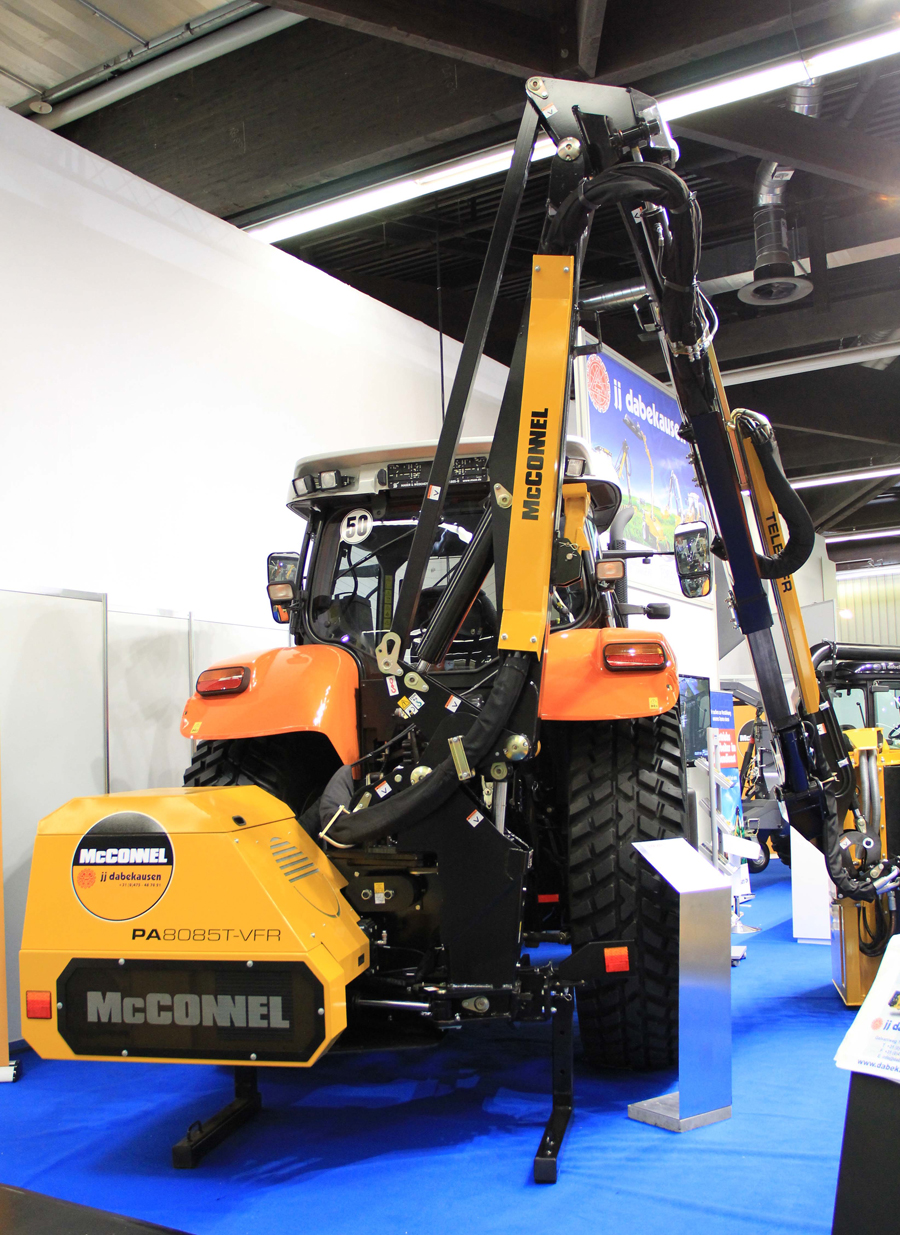 Im McConnel Auslegermäher PA8085VFRT kombiniert JJ Dabekausen BV erstmals einen teleskopierbaren Arm mit einer variablen Vorwärts Reichweite (VFR System). Dieses System garantiert laut Hersteller einen besonders flexiblen Einsatz der Maschine und einen freien Blick des Fahrers auf den Mährotor und das Gelände. Mit einer Reichweite von acht Metern und einem Schwenkbereich um 108 Grad können – so JJ Dabekausen – auch schwer zugängliche Bereiche ausgemäht werden. Daneben kann der Ausleger mit verschiedenen Anbaugeräten ausgerüstet werden, was die Einsatzvielfalt des PA8085VFRT zusätzlich erweitern soll. Ein einfacher An- und Abbauvorgang der Maschine soll außerdem den Umbau des Traktors auf Winterdienst oder andere Arbeiten innerhalb einer halben Stunde möglich machen.