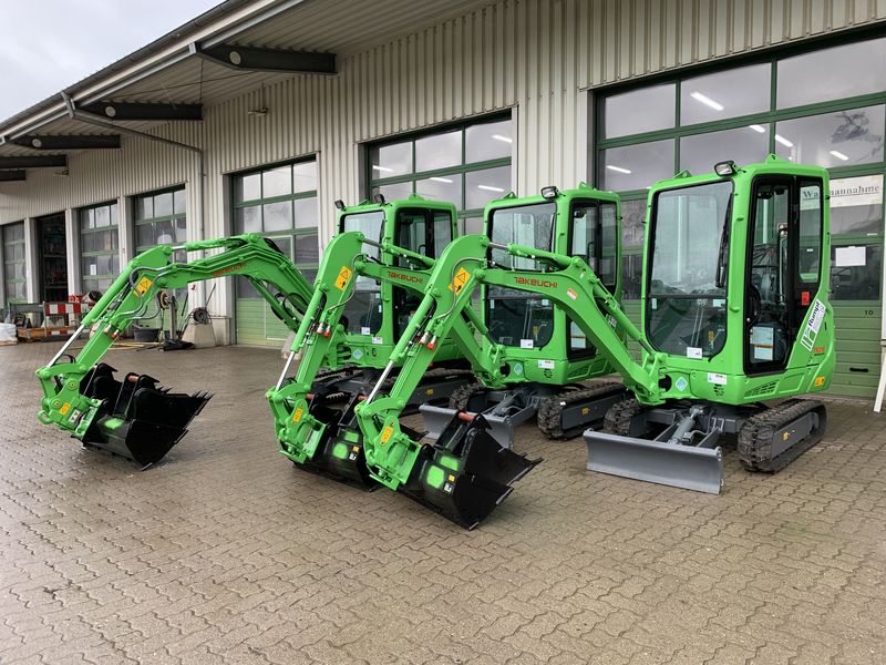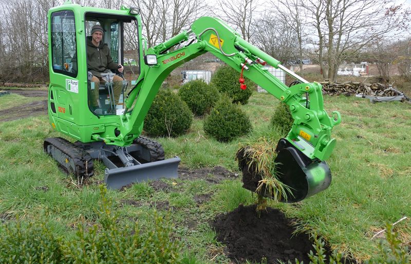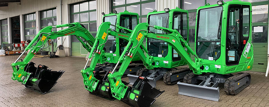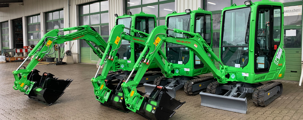 Drei neue Takeuchi-Bagger, einen TB 225 und zwei TB 216, hat die Erwin Rumpf Garten- und Landschaftsbau GmbH & Co. KG aus Nortorf in Schleswig-Holstein gekauft und damit seinen großen Maschinenpark erweitert. „Wir benötigen Bagger, die für sehr viele unterschiedliche Aufgaben einsetzbar, von hoher technischer- und Materialqualität und mit einem Anhänger von Einsatzort zu Einsatzort umsetzbar sind. All diese Voraussetzungen haben die Takeuchi-Bagger erfüllt“, sagt Oliver Rumpf, gemeinsam mit seinem Bruder Felix und seinem Vater Ingo Geschäftsführer der Firma.