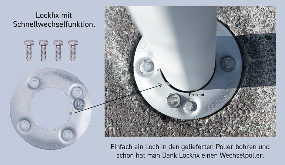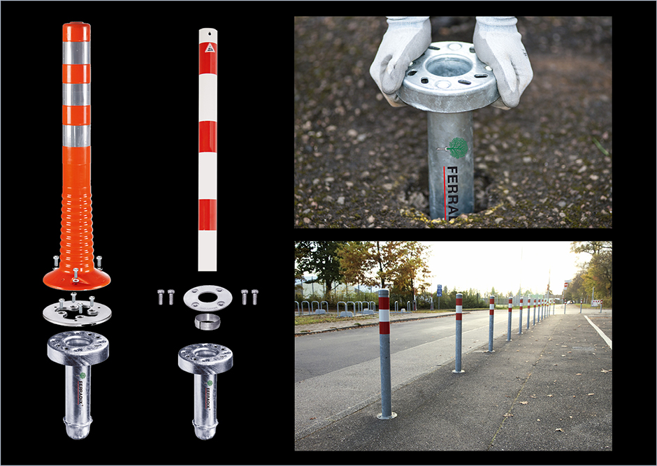 Ab sofort werden passende FERRADIX-Bodenanker mit hochwertigen Absperrpollern kombiniert. So entfallen aufwendige Recherchen, welches Fundament für welchen Poller benötigt wird. Und das Beste: Statt mühsame Erdarbeiten durchzuführen, ist die Montage mit dem Wurzelpfahl in allen Böden denkbar einfach. Entweder mit dem neuen „Betonspardübel“ FERRADIX City oder sogar ganz ohne Beton mit dem Modell FERRADIX Alpha. Neben Standardpollern, bei denen die Kombis einen großen Kostenvorteil bringen, führen innovative technische Kniffs zu ganz neuen Möglichkeiten. So kann beispielsweise mit der neuen Verriegelungsplatte „Lockfix“ jeder stationäre Poller einfach und schnell in einen ortsveränderlichen Poller verwandelt werden. Zur Markteinführung sind die Kombinationen nun zu recht günstigen Preisen erhältlich.