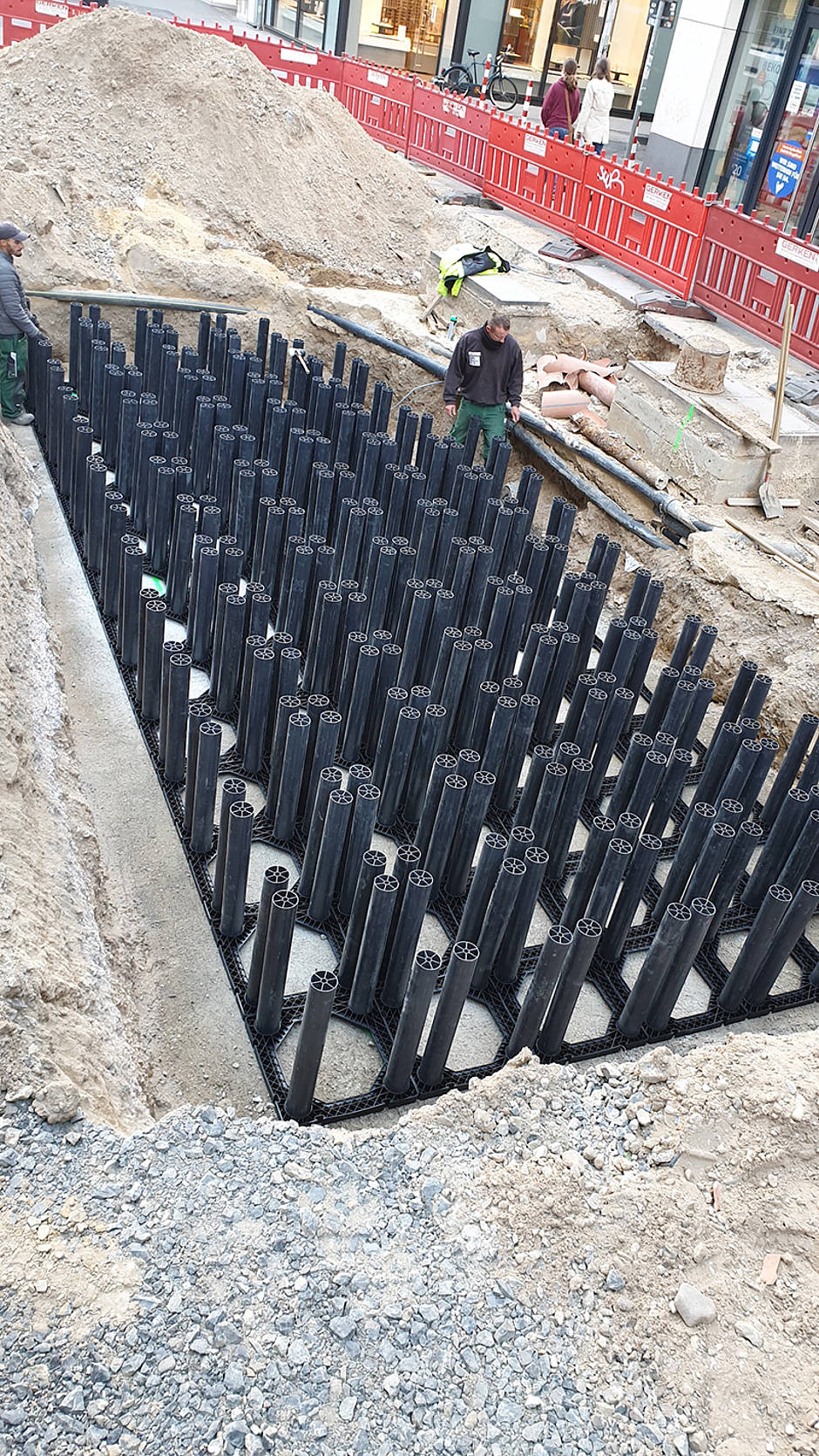 Die Flexibilität des Systems überzeugt: Beim Einbau stießen Suckau und sein Team immer wieder auf bislang unkartierte Leitungen und Rohre. Statt die Pläne permanent zeitraubend anzupassen, ließen sich die Komponenten einfach an die Gegebenheiten vor Ort anpassen: Durch Einkürzen der Pfosten kann jede gewünschte Höhe hergestellt werden. Auf diese Weise konnte die Leitungsinfrastruktur integriert oder nah am Systemkörper vorbeigeführt werden. Zug um Zug entstanden so die insgesamt neun Baumquartiere.