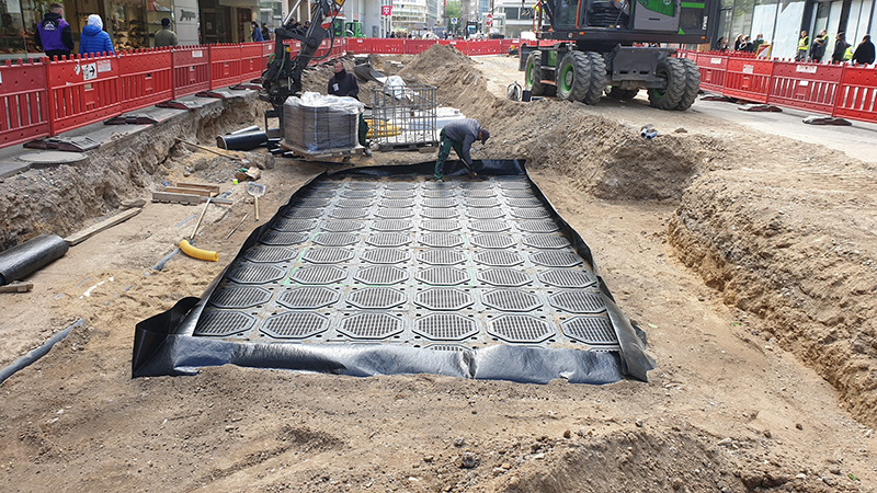 Mit dem fertigen TreeParker-Baumquartier erhalten die Lederhülsenbäumen fortan sehr gute Standortbedingungen: Statt verpresster Pflanzerde finden sie im TreeParker lockeres, gut belüftetes Substrat. In Düsseldorf wurden die Quartiere extra großzügig angelegt und bieten pro Baum mehr als die von der Forschungsgesellschaft Landschaftsentwicklung Landschaftsbau e.V. (FLL) empfohlenen zwölf m3 Fläche. „An solchen extremen Standorten hat der Baum ohnehin mit vielen Faktoren zu kämpfen“, gibt Suckau zu bedenken. „Eine belebte, zugepflasterte Einkaufsstraße oben, die U-Bahn unten, dazu Hitze und Trockenheit. Mit dem TreeParker haben die Bäume die Chance, langfristig gesund zu bleiben.“