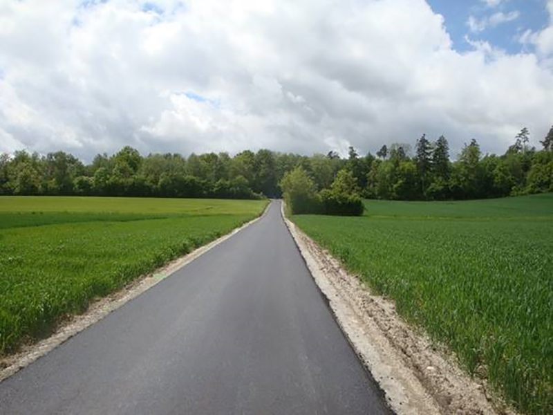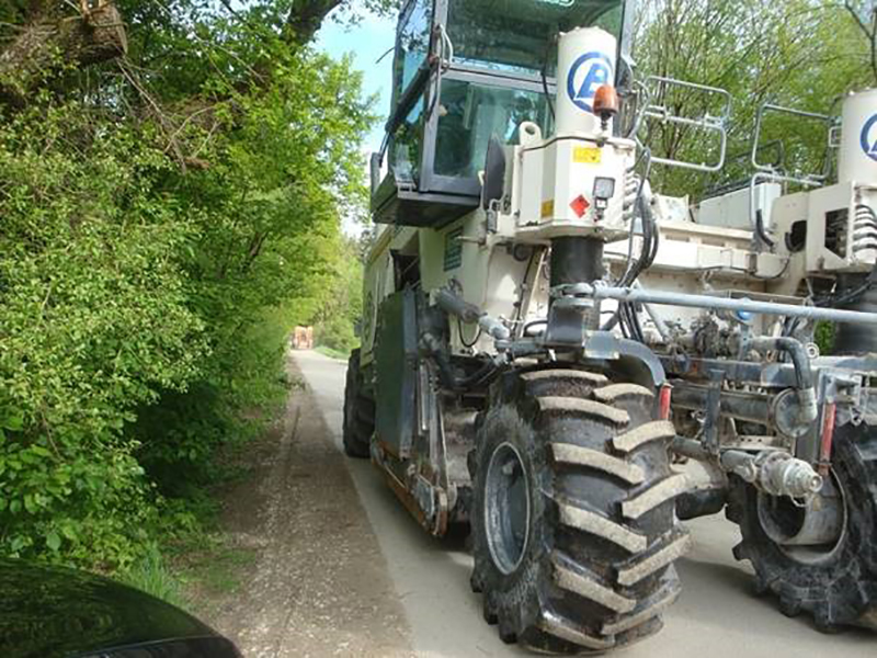Am 02. Februar wurde mit der Entnahme der Bodenproben für die Bestimmung der Rezeptur begonnen. Zur Angabe des exakten Mixverhältnisses wurden ca. 50 Liter Bodenmaterial per Schürfung für das Labor entnommen. Nach wenigen Tagen stand dieses fest und stellte die Grundlage für die Verarbeitung der vor Ort befindlichen Böden dar. Danach folgten die Vorarbeiten inklusive Verlegung der Wasserleitung und Abziehen der Bankette sowie Aufziehen von Vorlagematerial. Um die spätere Entwässerung des Weges zu gewährleisten, wurden vor den Stabilisierungsarbeiten die Bankette frei gemacht. In manchen Fällen ist es zusätzlich notwendig, Material vorzulegen, um die vorhandene Neigung des Weges anzupassen. Danach fanden Stabilisierungsarbeiten im Panmax-Verfahren in einer Schichtdicke von 25cm statt. In wenigen Arbeitsschritten wurde die Stabilisierung mit dem vorhandenen Bodenmaterial, Zement sowie Nanopartikeln realisiert. Die fertige Tragschicht benötigte im Anschluss ca. 24 bis 48 Stunden Aushärtungszeit und konnte im Anschluss wieder befahren werden. Ende Mai wurde als Abschlussschicht eine circa 09 cm dicke Asphaltschicht eingebaut. Während der Arbeiten war es glungen, die Vollsperrung der Straße auf ein Minimum zu reduzieren.