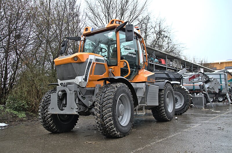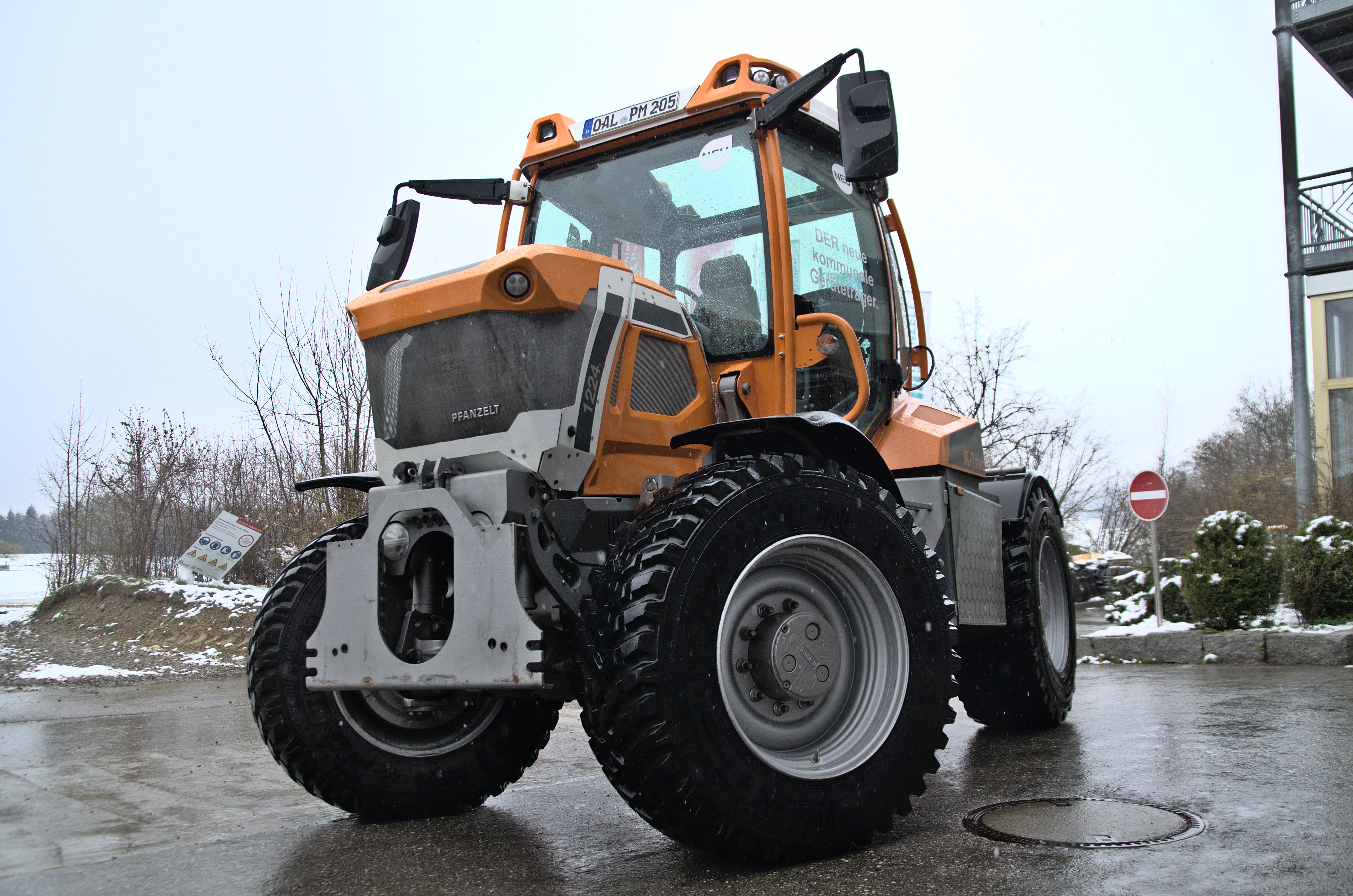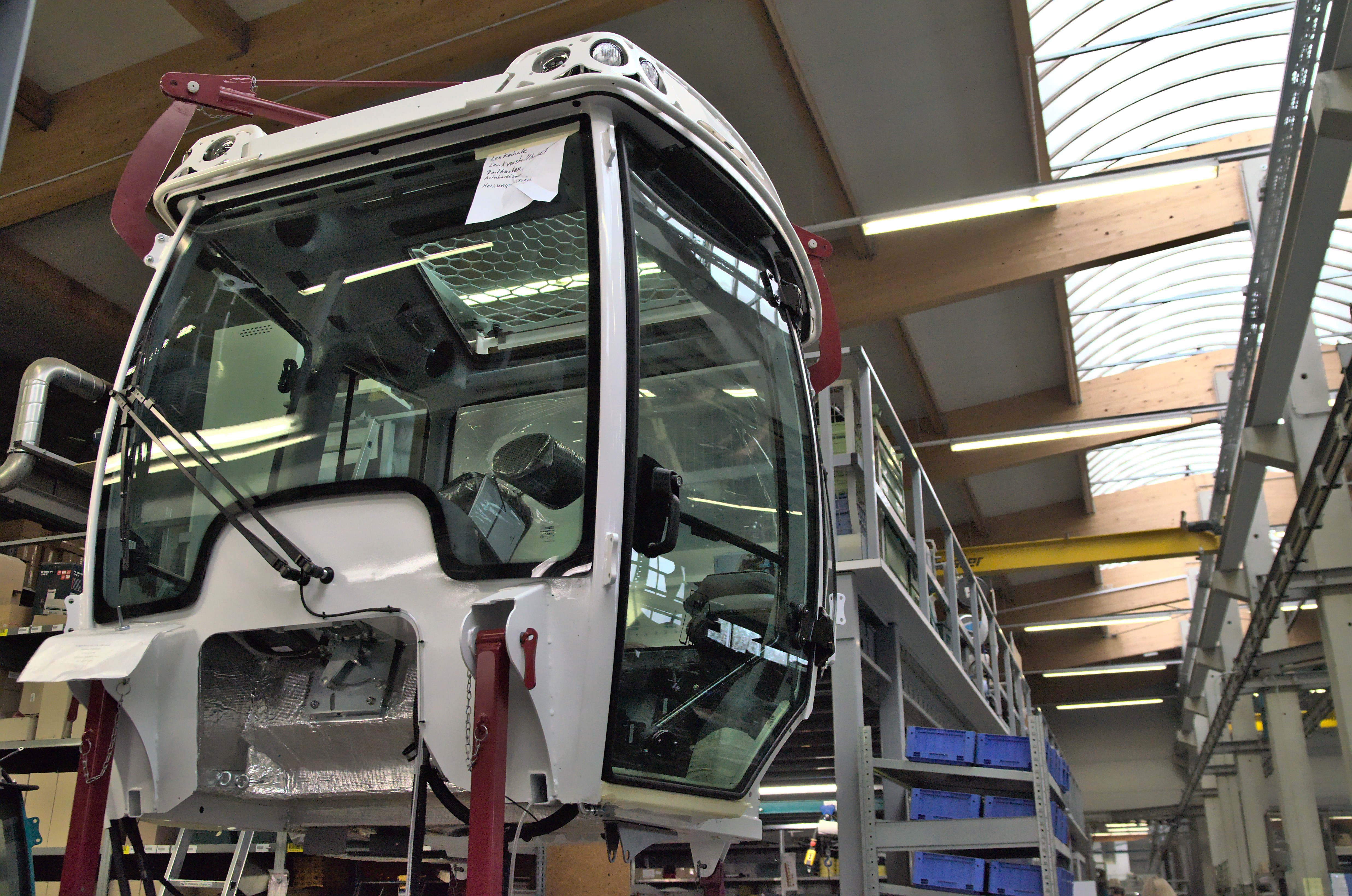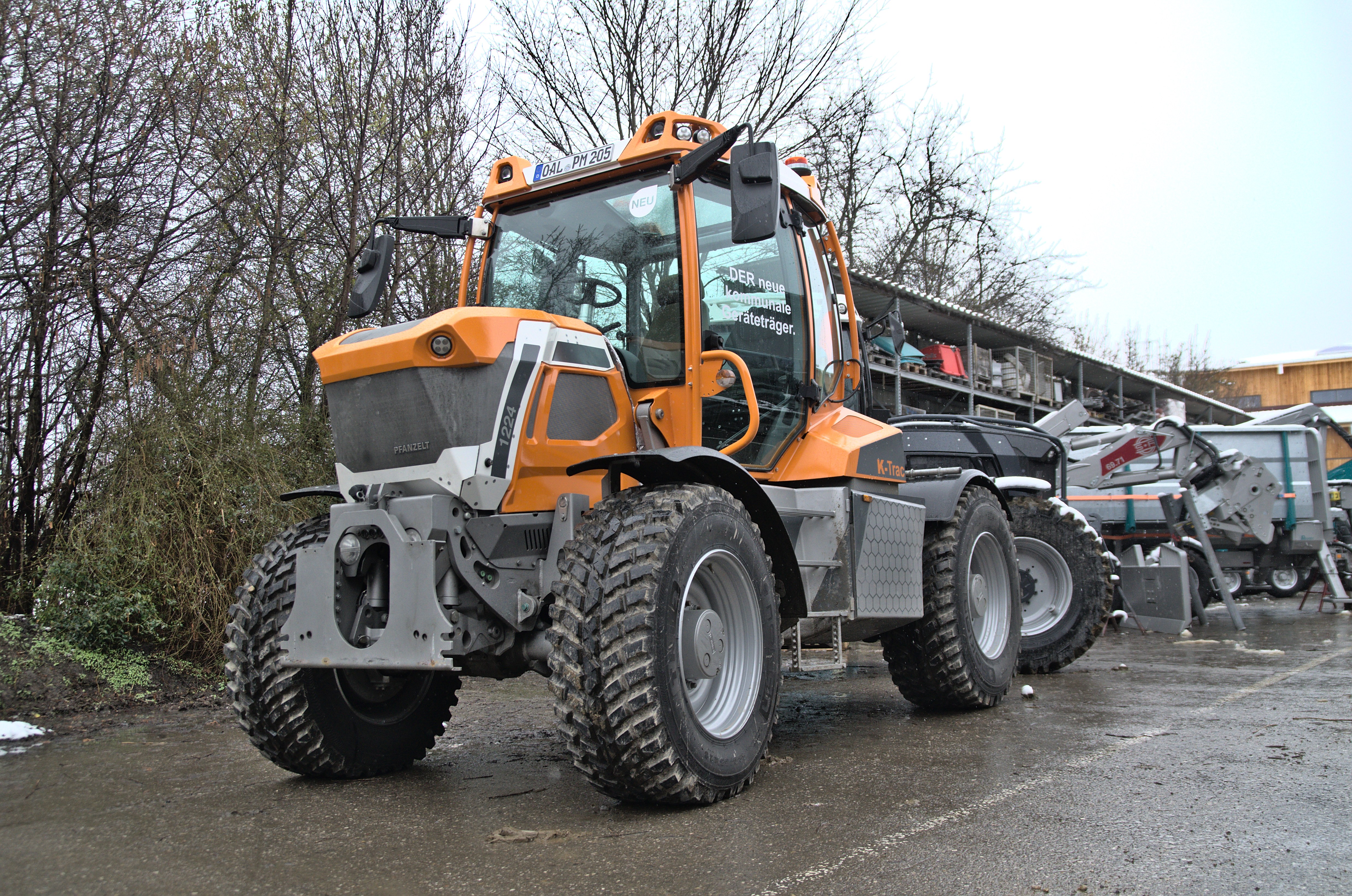 Auf den ersten Blick sticht die Länge des K Tracs ins Auge: Mit knapp fünf Metern – bei circa 3,33 Meter Radstand – fällt dieser größer aus, als der über knapp zwei Jahrzehnte hinweg arrivierte Pm-Trac-Forstschlepper der Ostallgäuer. Es wurde Platz geschaffen, um beispielsweise im Heck einen Vier-m3-Streuer Huckepack zu nehmen. Außerdem ist das neue Fahrzeug höher. Eine Stufe mehr gilt es zu erklimmen, um im geräumigen Bedienerstand Platz zu nehmen. Clever gelöst: Aufgrund der durchdachten Anordnung der einzelnen Geräteräume sowie der Antriebstechnik war es den Ingenieuren möglich, die Fahrzeugkabine in der Mitte des Geräteträgers zu platzieren. Übrigens entspricht die XXL-Kabine exakt jener des Pm Trac, klärt Eberhard Scheu, der für die Produkteinführung des K Trac verantwortlich zeichnet, beim Firmen-Rundgang auf.