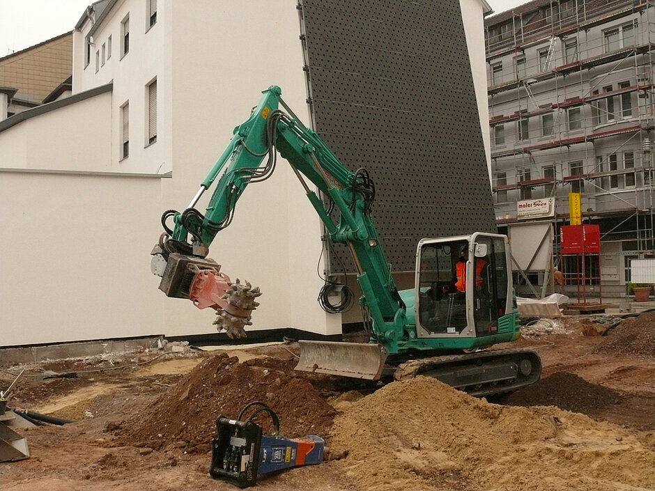 Zunächst musste eine 30 cm starke Bodenplatte aus massivem Beton abgebrochen werden. Diese reichte an die umliegende Wohnbebauung und die Fußgängerzone heran, so dass man des Öfteren im wahrsten Sinne des Wortes höchst sensibel und auch „um die Ecke“ arbeitete. Dank seiner präzise arbeitenden Steuerung und Ausrüstung zeigte sich der Takeuchi TB 290 auch dabei als außerordentlich effizientes Arbeitsgerät. Die angrenzenden Hauswände wurden mit Vegetationstechnik ausgerüstet. Das heißt, dass sie nach Bauende begrünt und zu vertikalen Gärten werden. Weiterhin musste der Untergrund vorbereitet und mit Kanälen, Wasserleitungen oder Kabel versehen werden.