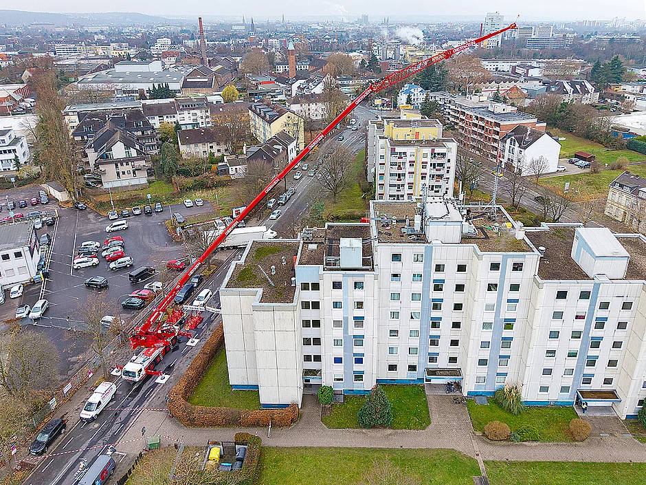 GERKEN Krane und der hauseigene Baustellen-Absperr-Service realisieren gemeinsam ein Mobilfunkprojekt in Bonn: Der zum aktuellen Zeitpunkt größte GERKEN-Kran – der GGK 100 – hebt aus 60 Metern Entfernung einen Antennenmast auf ein 21,60 Meter hohes Wohngebäude. Auf dem Dach wird die Antenne von Fachkräften installiert. Einheitliche Koordination sichert hier eine effiziente Abwicklung.