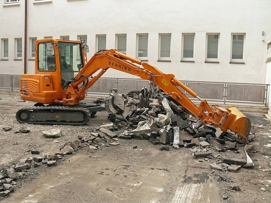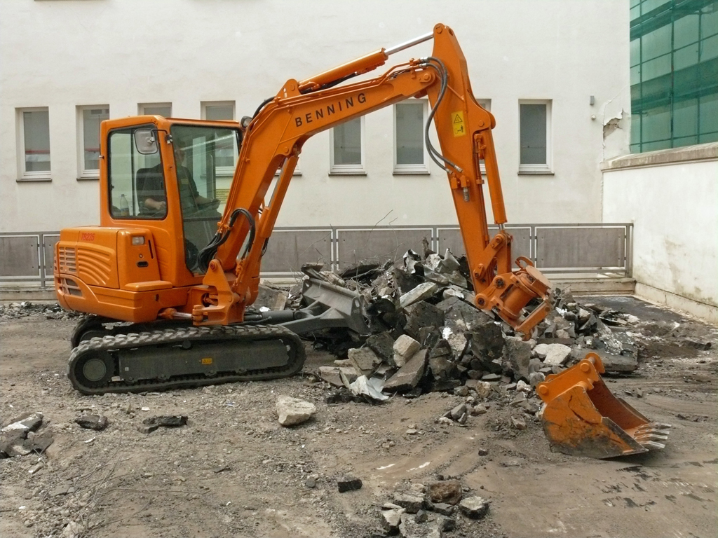 Wechselnde Aufgaben verlangen auch immer, die besten Voraussetzungen mitzubringen, um die unterschiedlichen Bauaufgaben zu lösen. Deshalb gehört eine umfangreiche Serienausstattung zum TB 235, wie beispielsweise ein Schwenkmotor, der das Anbaugerät um 2 x 87° bewegen kann, ein hydraulischer Schnellwechsler, der die verwendeten Anbaugeräte innerhalb von Sekunden mit Bedienung aus der Kabine wechseln kann, ein erster und zweiter Zusatzkreislauf und natürlich eine Überlastwarneinrichtung, Rohrbruchsicherung und Lasthalteventile. All diese Ausstattungsmerkmale gehören zur Standardausrüstung des Takeuchi TB 235. Was die Qualität dieses Kompaktbaggers auch ausmacht, ist eine außerordentlich komfortable Kabine. Sie ist hervorragend gefedert und isoliert den Schall besonders effektiv, was die Konzentration auf die Arbeit leicht macht. Alexander Ritter, der zuständige Polier von Benning, stellte zunächst aber etwas ganz anderes fest: „Zuerst ist man irritiert und denkt, der Motor läuft gar nicht, denn er ist so leise und vibrationsarm. Daran muss man sich erst gewöhnen.“ Ebenso, wie an die vielen Möglichkeiten, die sich aus der Ausstattung mit Powertilt Schwenkmotor und Symlock-Adapter ergeben.