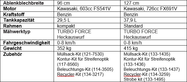 Erweitert wurde die Grandstand-Serie, die bisher aus drei Seitenauswurfmodellen mit den Schnittbreiten 91, 102 und 122 cm bestand, um zwei weitere Modelle mit Heckauswurf in den Schnittbreiten 91 cm (36") und 122 cm (48"). Da das Seitenauswerfen immer weniger Akzeptanz am Markt gewinnt, wurde der Wunsch der Kunden und Händler nach einem Mäher mit Heckauswurf berücksichtig. Das Mähen mit Heckauswurf bietet mehrere Vorteile, wie z.B. das reduzierte Risiko von seitlich ausgeworfenen Gegenständen, da das Schnittgut innerhalb der Mähbahn abgelegt wird. Außerdem ermöglicht es ein randnahes Mähen, ohne das Schnittgut auf Wege oder Blumenbeete gelangt. Das Mähen mit Heckauswurf bietet zudem die Möglichkeit, längere Grashöhen zu bewältigen, ohne dass das Schnittgut auf das ungeschnittene Gras geworfen wird. Gleichzeitig wird weniger Leistung benötigt und Kraftstoff eingespart. Es wird das Abmähen von bereits geschnittenem Gras vermieden. Außerdem besitzen solche Mäher eine geringere Transportbreite - keine Seite auswurfklappe, die die Transportbreite vergrößert.
